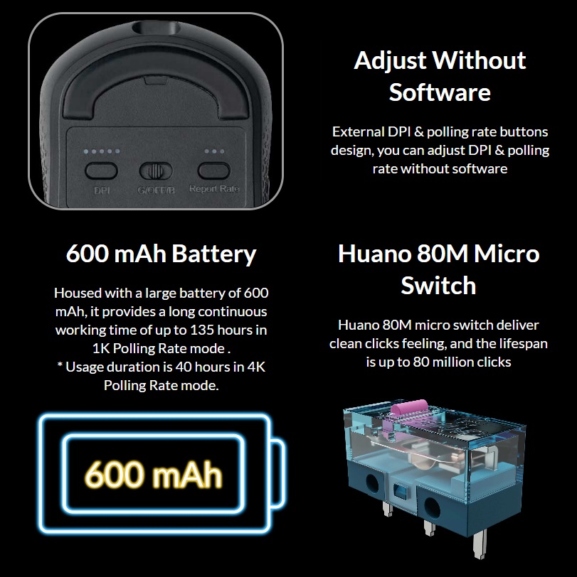 - Huano 80M Micro Switch: Experience clicks that feel so satisfying you might just start clicking for fun. With a lifespan of 80 million clicks, it’s perfect for those who thrive on repetition… or revenge.