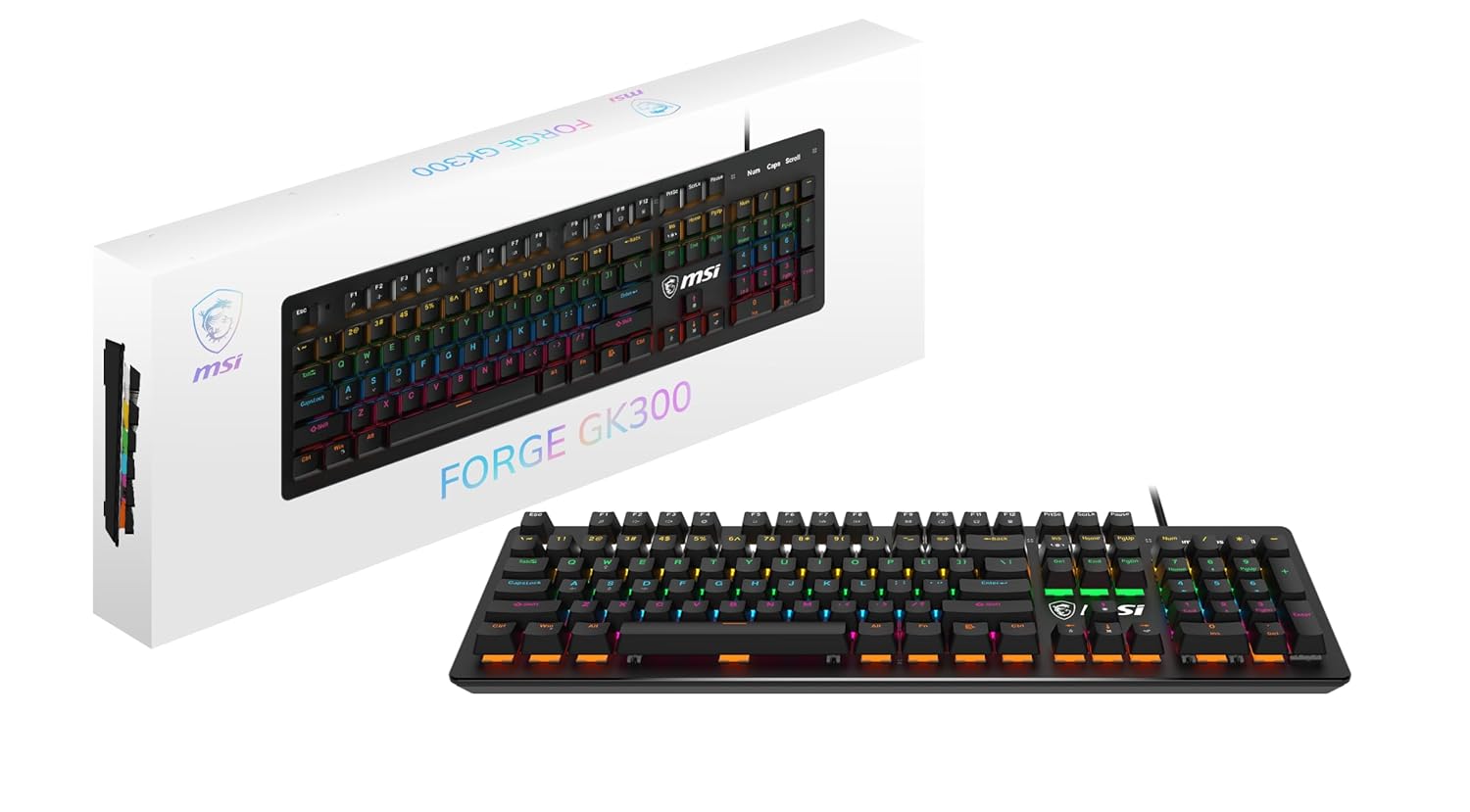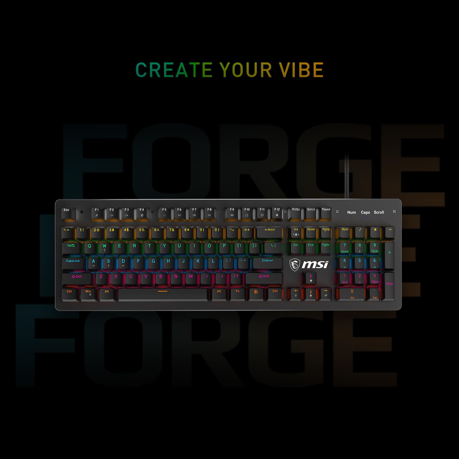 MSI Forge GK300 Blue US – Mechanical Keyboard, Hotkeys Rapid Control Blue SWITCHES, 9-Mode RGB , Ergonomic, Anti-GHOSTING, Angle-Adjustable , Floating Keycap (Black)