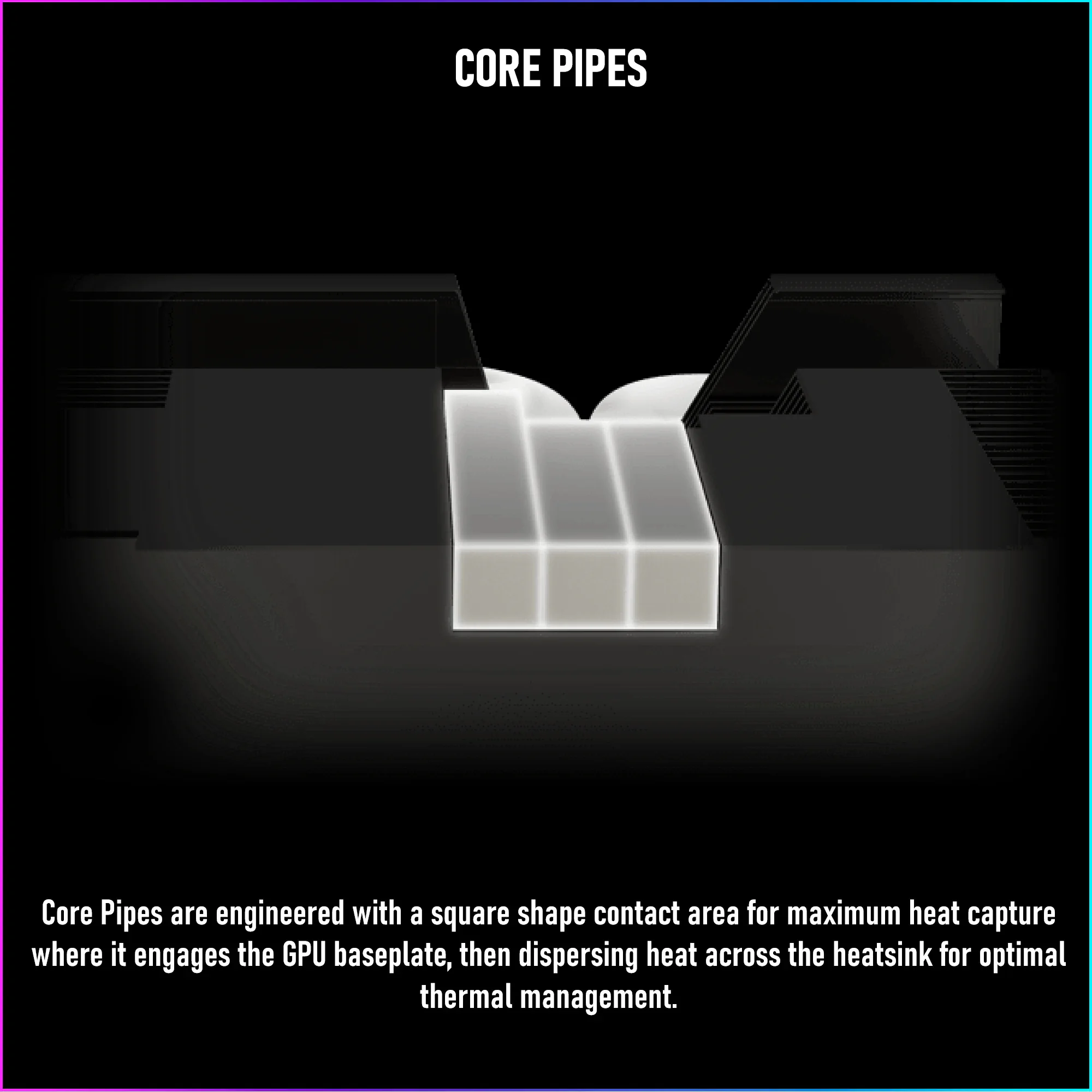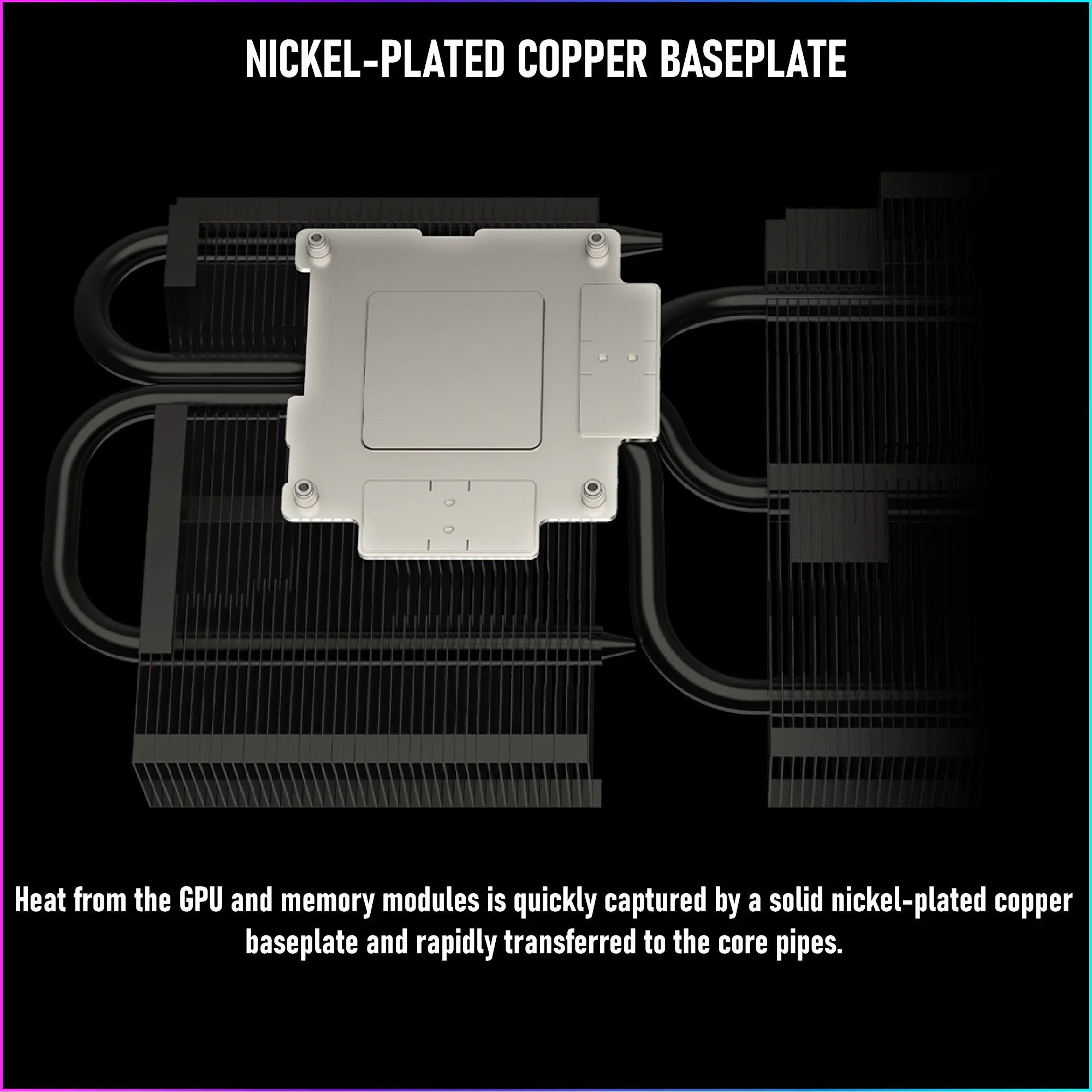- Core Pipes & Nickel-Plated Baseplate : Transfers heat straight from the GPU core with square contact pipes for optimal thermal spread.