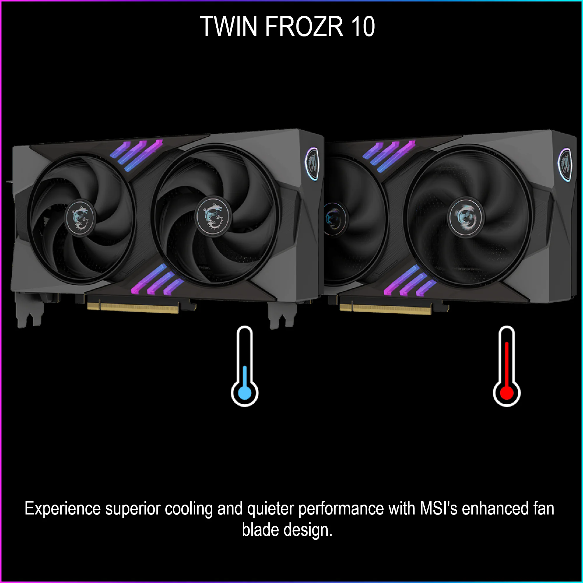 - TWIN FROZR 10 Cooling Design : Dual fans with Hawk-inspired blades, precision-crafted Wave Curved 4.0 fins, and a nickel-plated copper baseplate for silent and deadly heat dissipation.