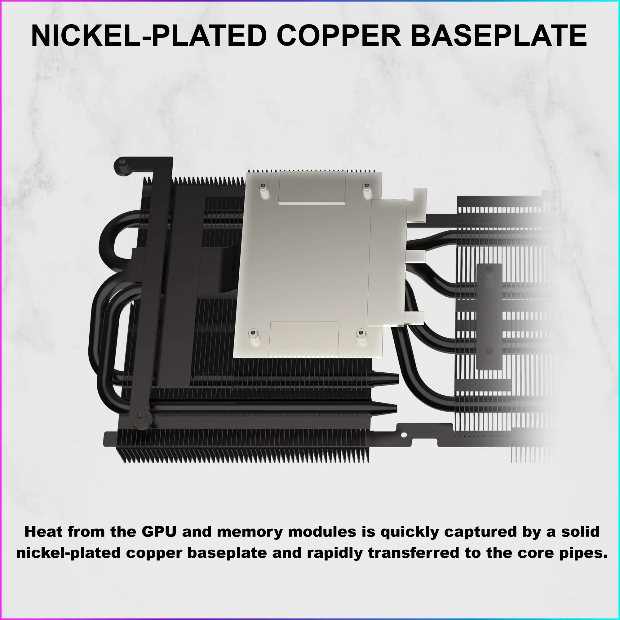 - Nickel-Plated Copper Baseplate: Rapid heat transfer from GPU and memory to heatpipes for relentless performance under load.