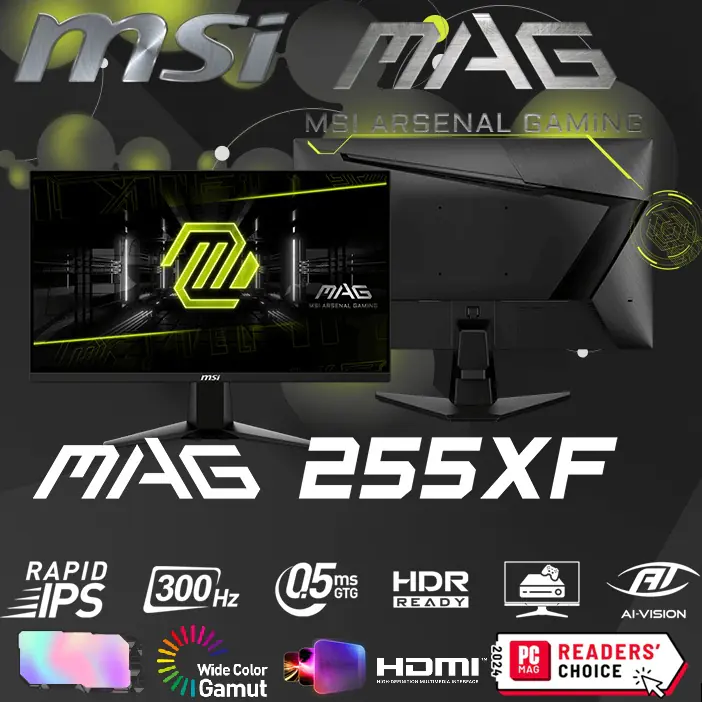 MSI MAG 255XF 25 inch FHD 300Hz Flat Gaming Monitor ; FHD (1920 x 1080) Rapid IPS Panel 0.5ms (GtG, Min.) ; Adaptive-sync ; AI Vision ; Less Blue Light ; DisplayPort 1.4a + 2 x HDMI™ 2.0b | Metallic Black