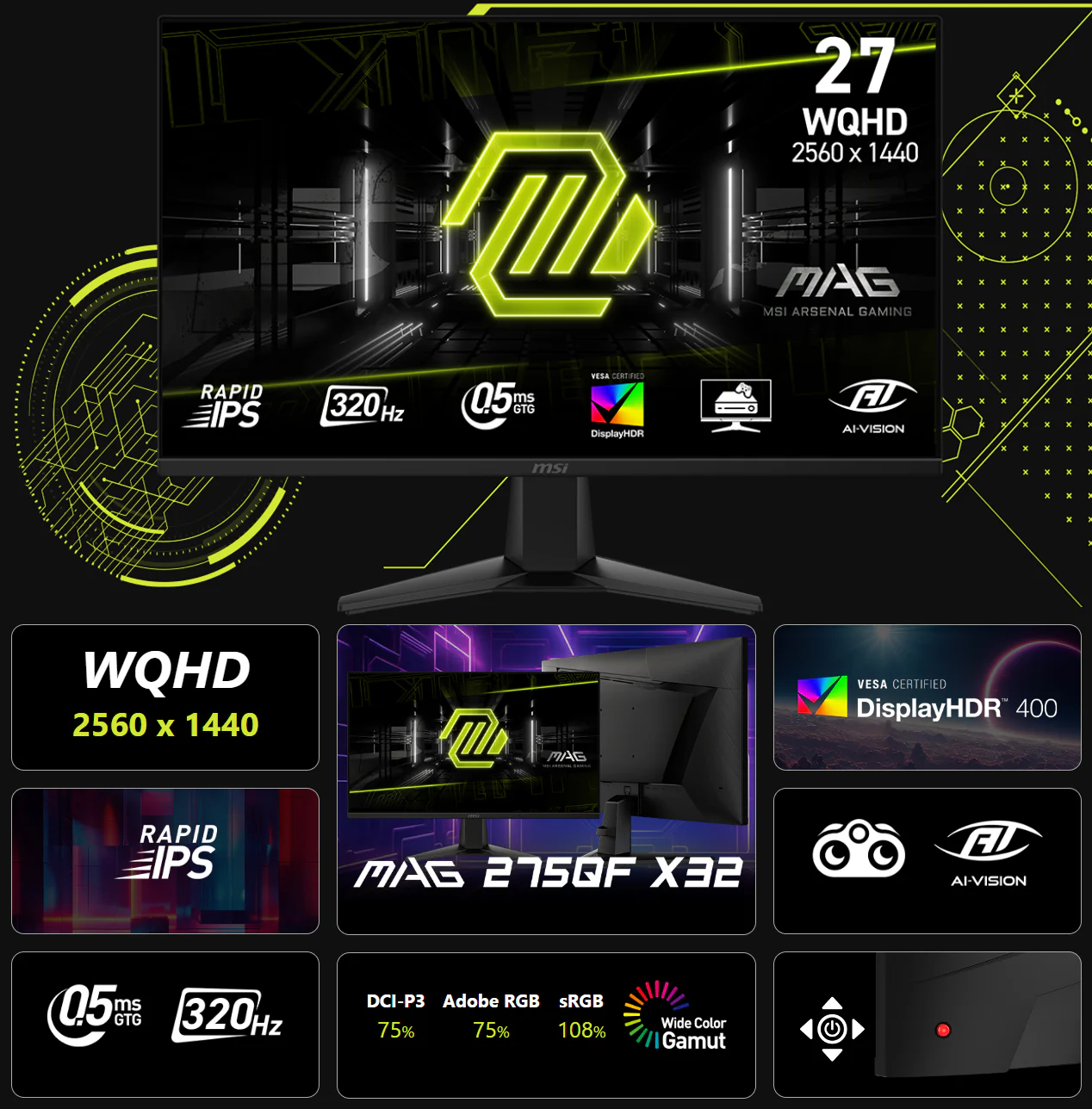 MSI MAG 275QF X32 27” WQHD 2560×1440 Rapid IPS Gaming Monitor With 320Hz Refresh Rate, 0.5ms Response, DisplayHDR 400, Adaptive Sync, AI Vision, HDMI 2.1, Tilt-Adjustable | 6 MONTHS WARRANTY