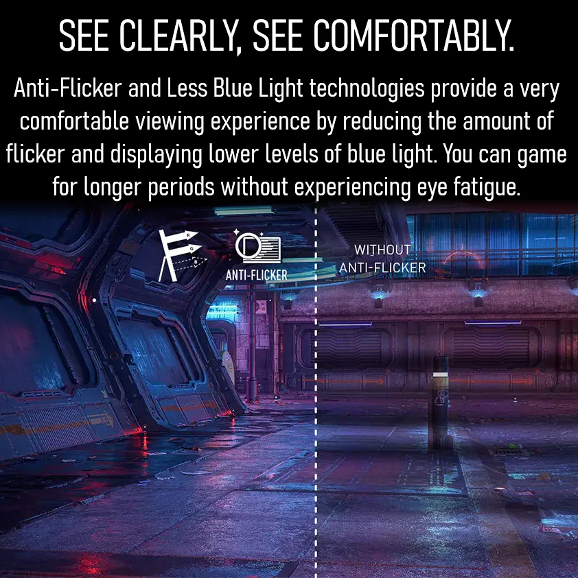 - MSI Eye Care Tech: Includes Anti-Flicker and Less Blue Light for extended comfort during long gaming or work sessions.
