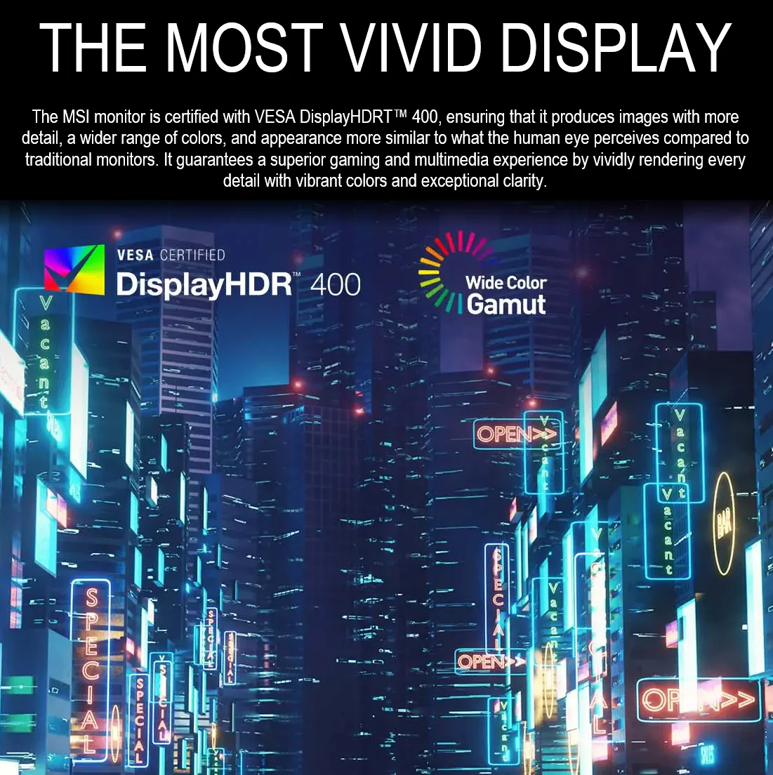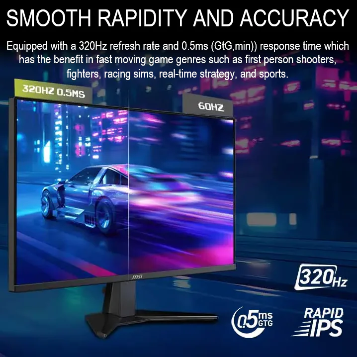 - Rapid IPS Panel: Enjoy fast response times and vibrant visuals thanks to MSI’s Rapid IPS technology that provides a 0.5ms (GtG, Min.) response time.