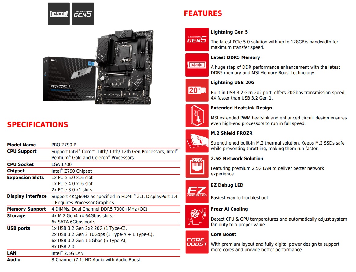 MSI Motherboard PRO Z790-P Support Intel® Core™ 14th/ 13th/ 12th Gen Processors for LGA 1700 socket – DDR5 Memory, Dual Channel DDR5 7000+MHz (OC) – PCIe 5.0 slot, Lightning Gen 4 x4 M.2, USB 3.2 Gen 2×2 | USED