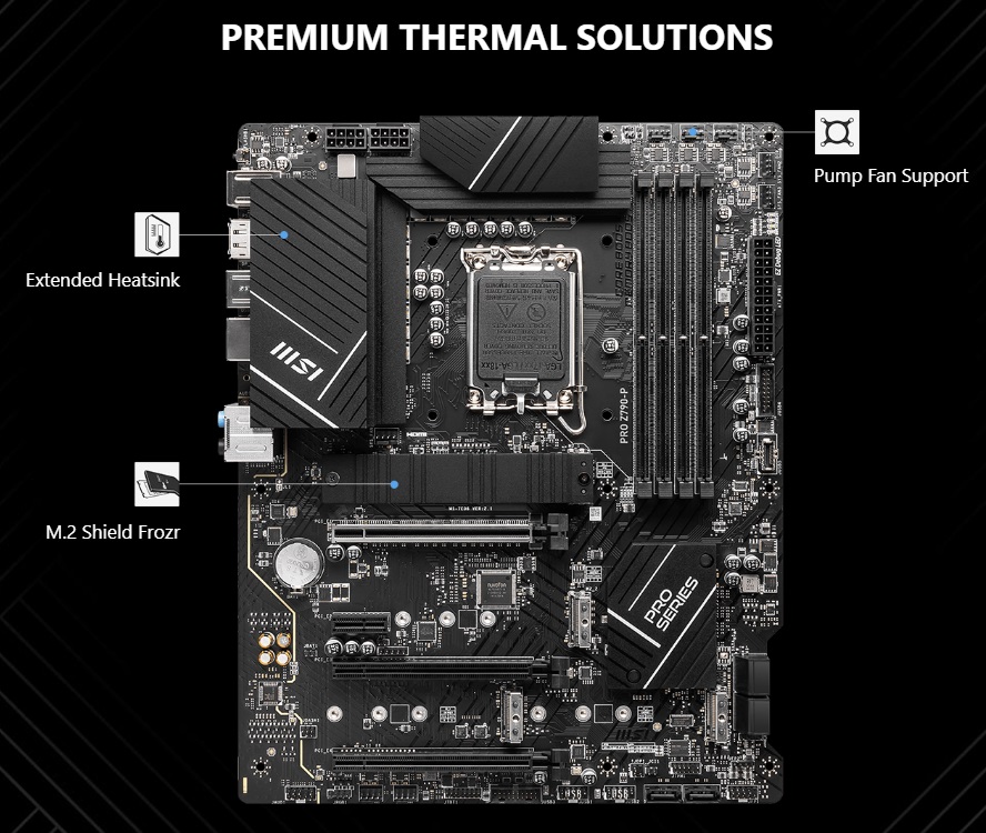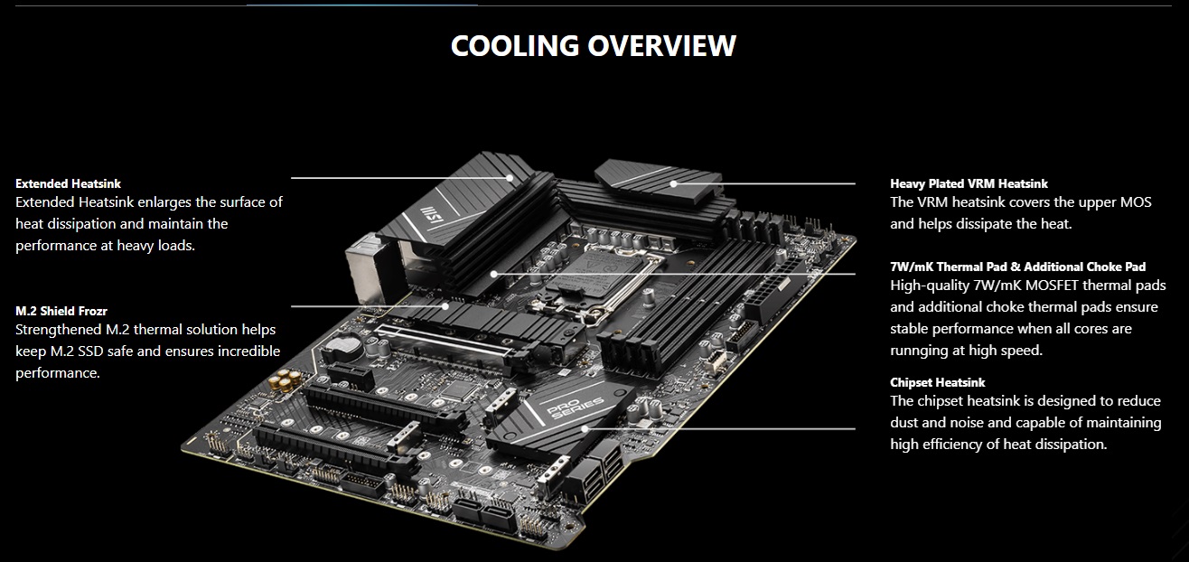 - Premium Thermal Solution: Extended Heatsink, MOSFET thermal pads rated for 7W/mK, additional choke thermal pads and M.2 Shield Frozr are built for high performance system and non-stop gaming experience