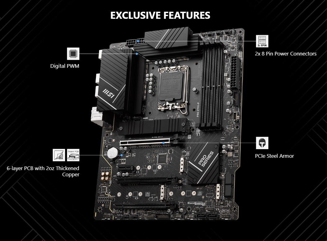 - Support Intel® Core™ 14th/ 13th/ 12th Gen Processors, Intel® Pentium® Gold and Celeron® Processors for LGA 1700 socket