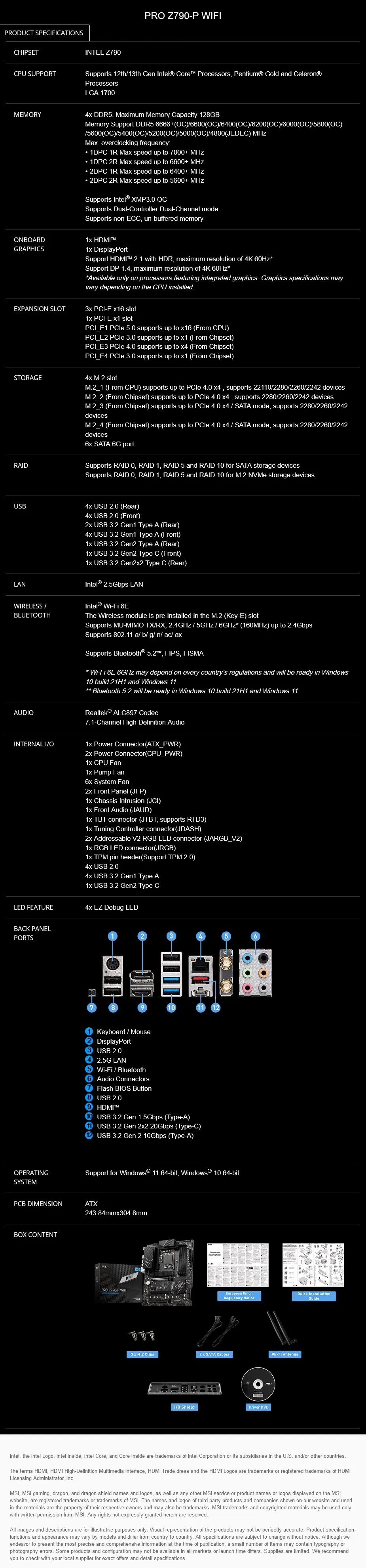 MSI PRO Z790-P WiFi ProSeries Motherboard (Supports 12th/13th Gen Intel Processors, LGA 1700, DDR5, PCIe 5.0, M.2, 2.5Gbps LAN, USB 3.2 Gen2, Wi-Fi 6E, ATX) ~- 1 Year Warranty
