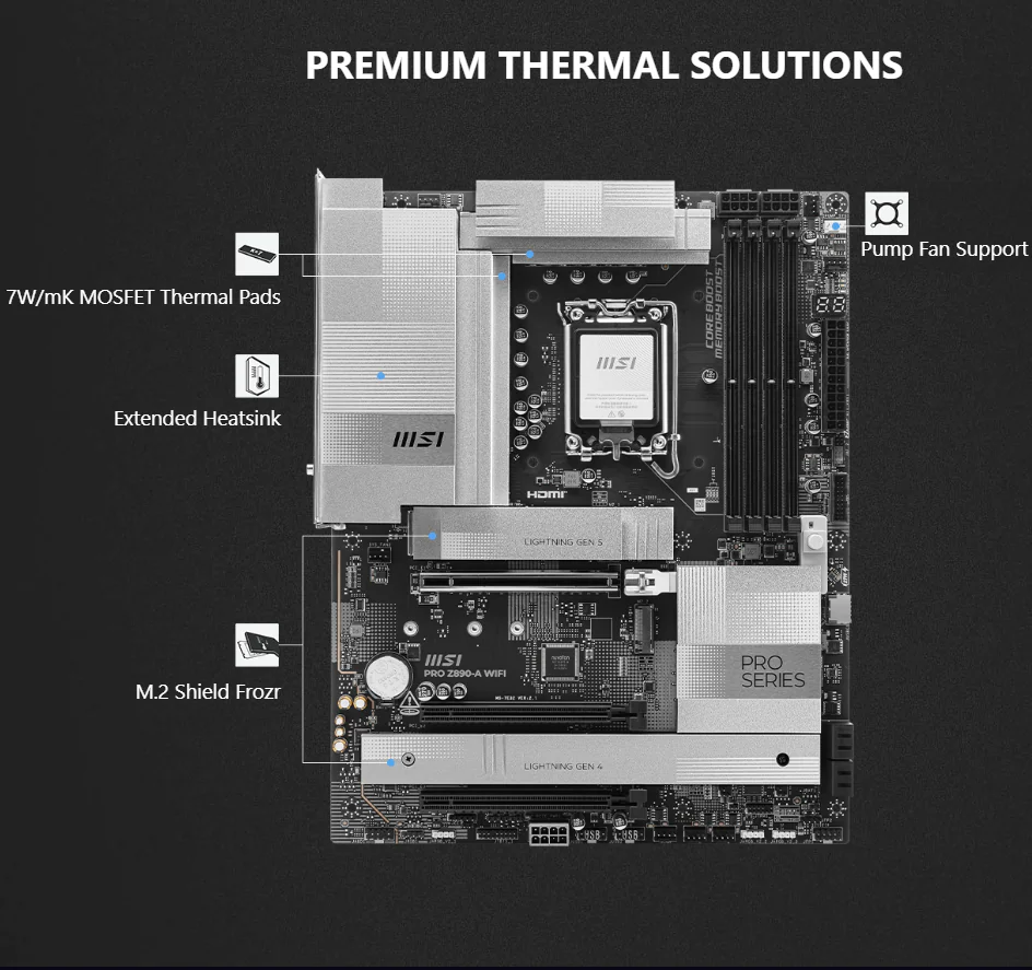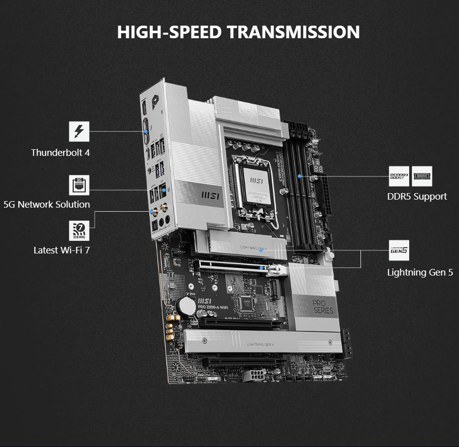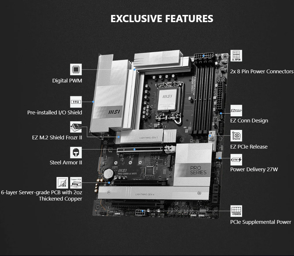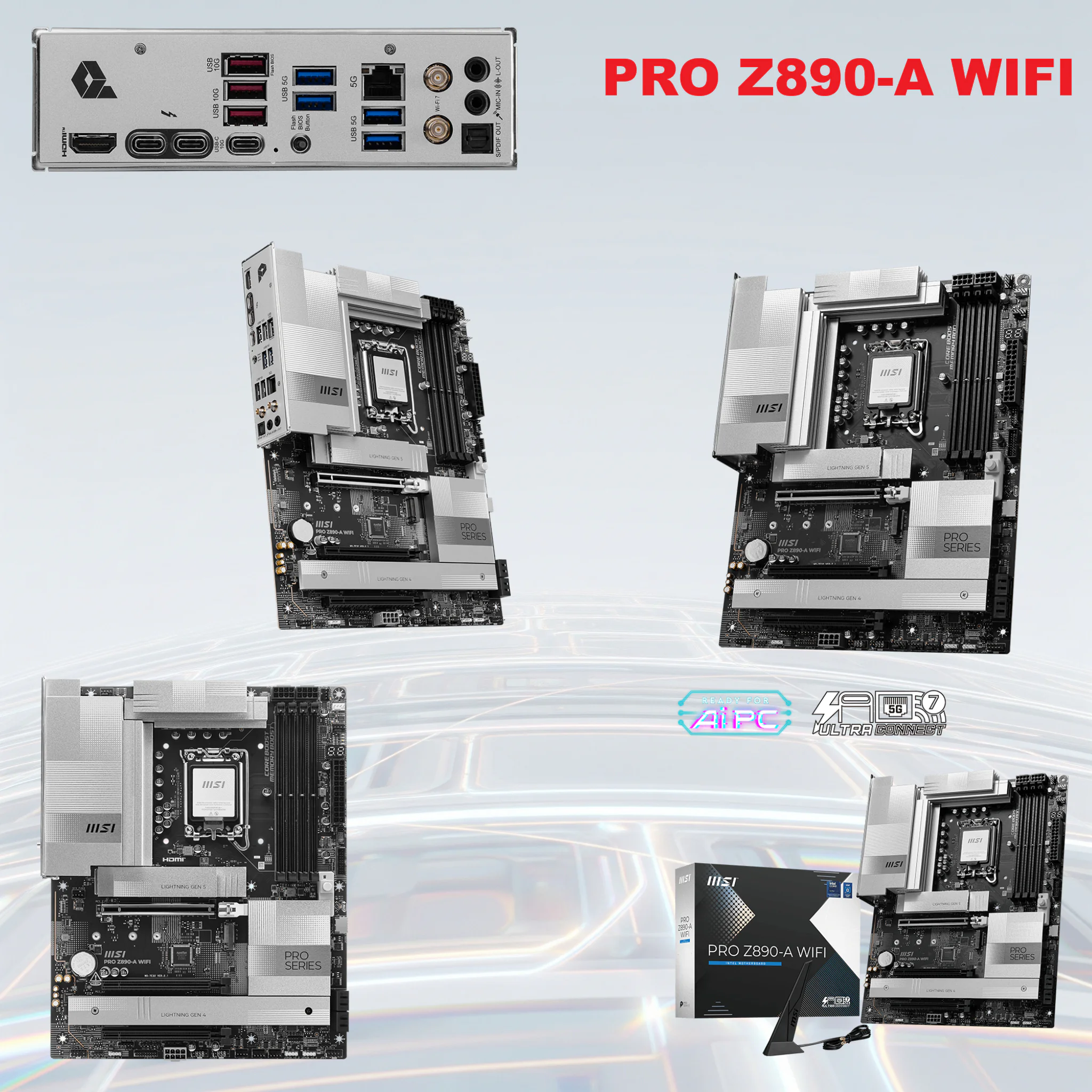 MSI Pro Z890-A WiFi ATX DDR5 Motherboard With Intel Z890 Chipset, Supports Intel® Core™ Ultra Processors (Series 2) LGA 1851 Socket, DDR5 9200+ MHz, PCIe 5.0, Wi-Fi 7, 5G LAN, Thunderbolt 4, AI Engine & EZ DIY Features