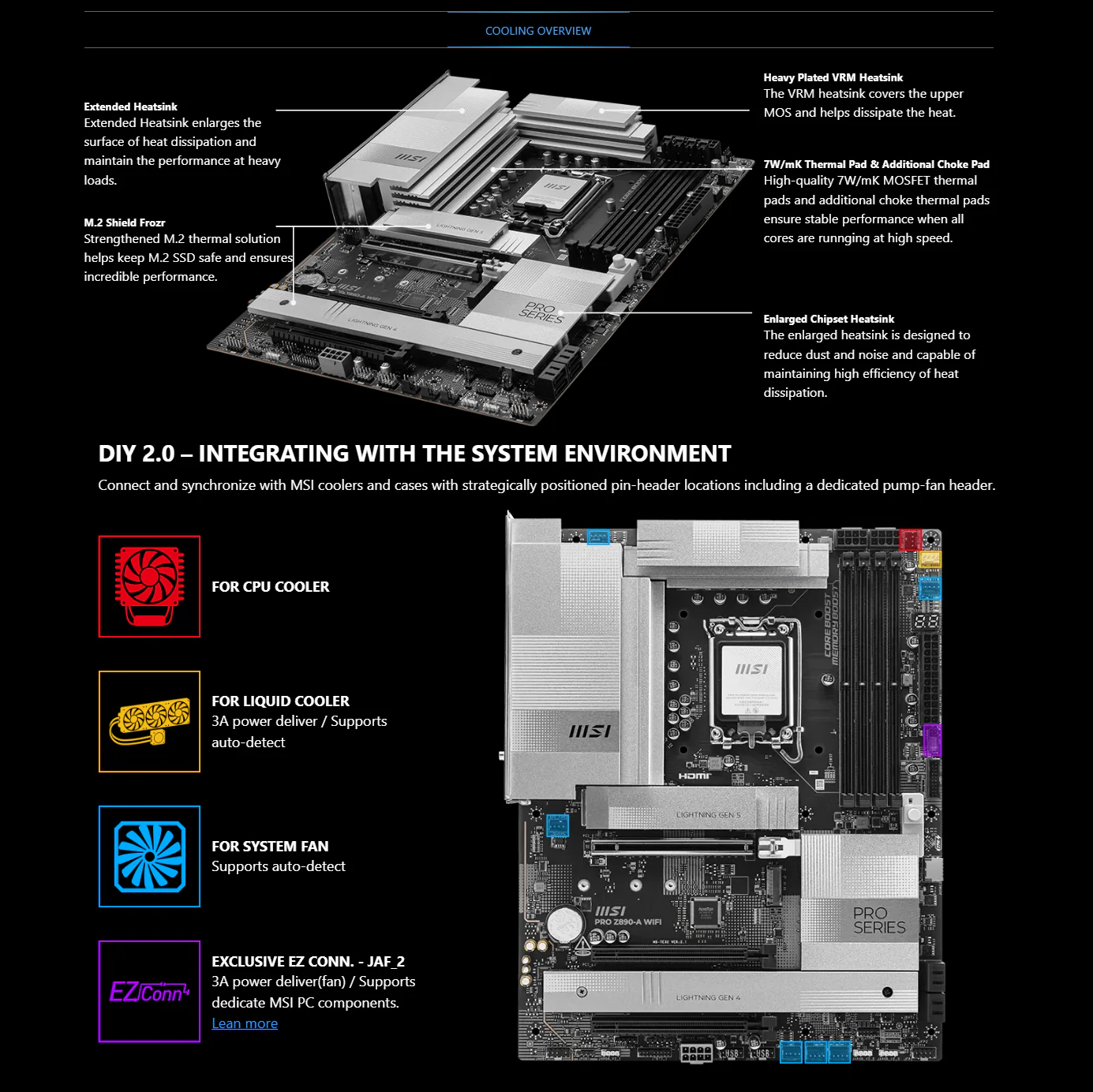 | Cooling | Extended heatsink, VRM heatsink, M.2 Shield Frozr II, 7W/mK thermal pads, Frozr AI Cooling |