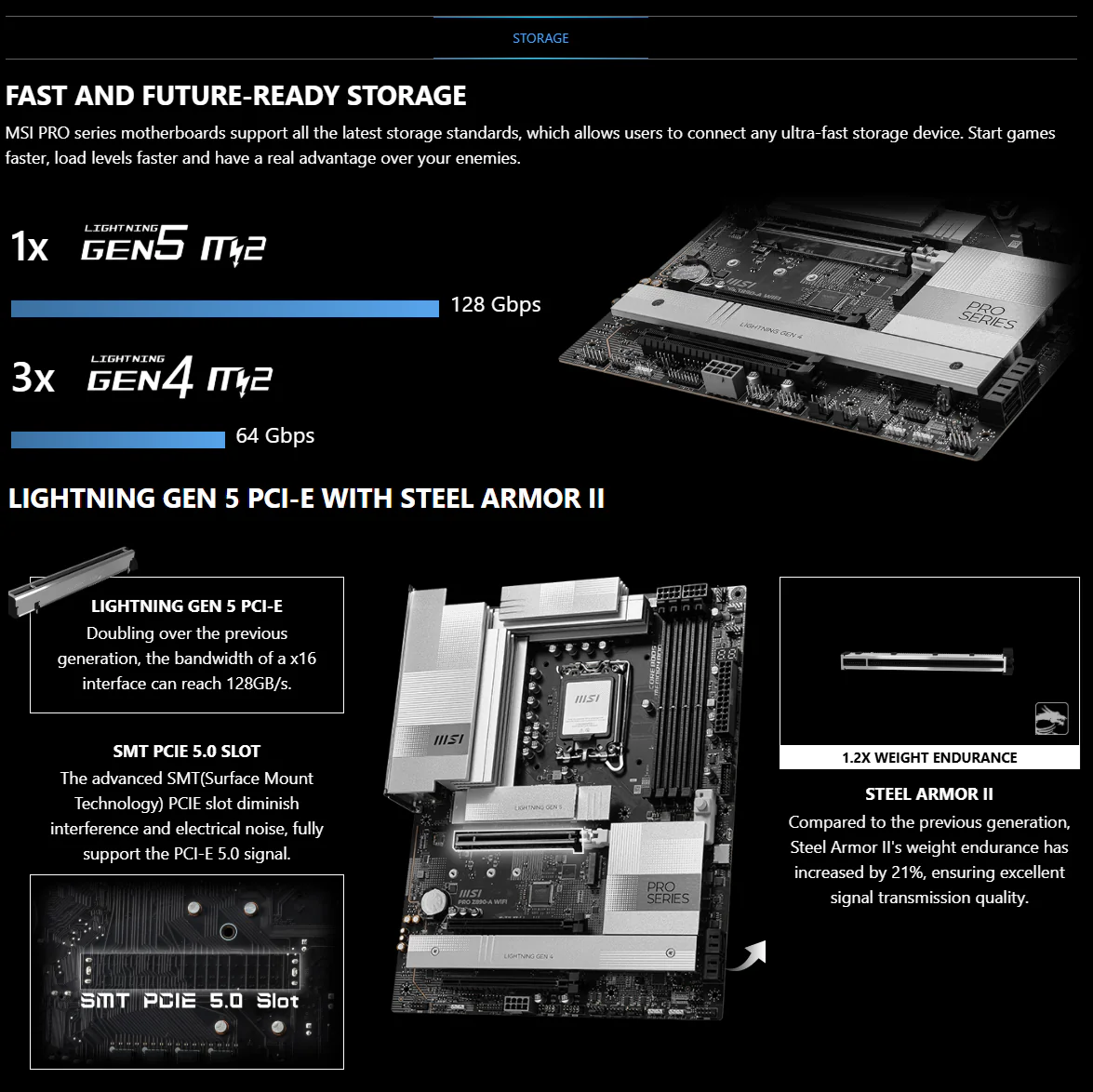 | Storage | 4x M.2 (1x PCIe 5.0, 3x PCIe 4.0/SATA), 4x SATA 6Gb/s, RAID 0/1/5/10 |