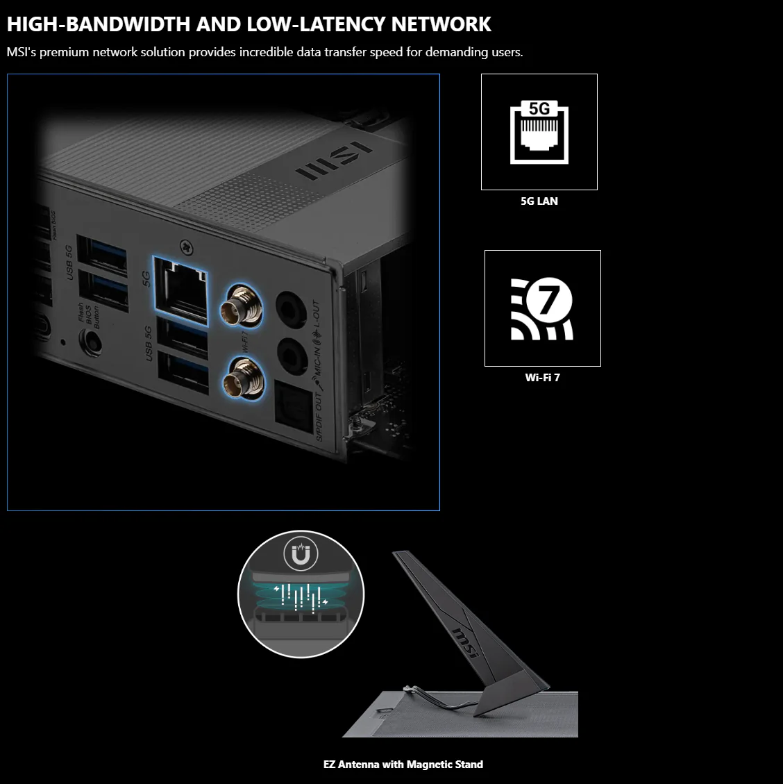 - Wi-Fi 7 + 5G LAN – Wireless speeds that laugh in the face of buffering, with wired LAN that pushes past Gigabit like it’s 2005.