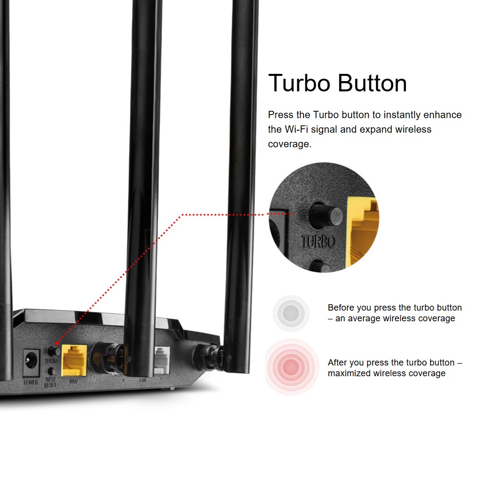 - Turbo button – instantly enhances the Wi-Fi signal and expands wireless coverage