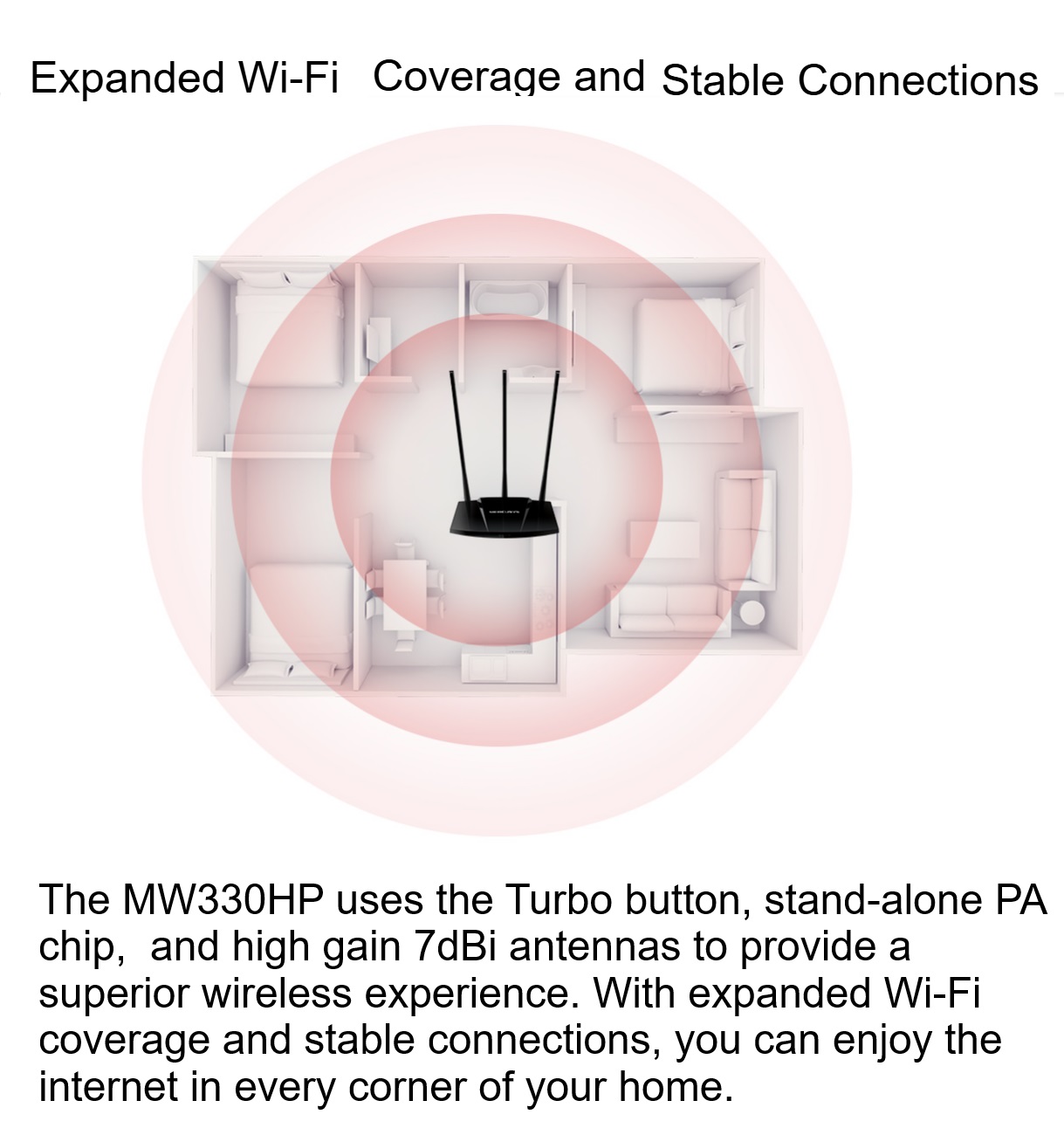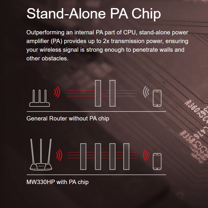 - Expanded Wi-Fi Coverage and Stable Connections : The MW330HP uses the Turbo button, stand-alone PA chip, and high gain 7dBi antennas to provide a superior wireless experience. With expanded Wi-Fi coverage and stable connections, you can enjoy the internet in every corner of your home.