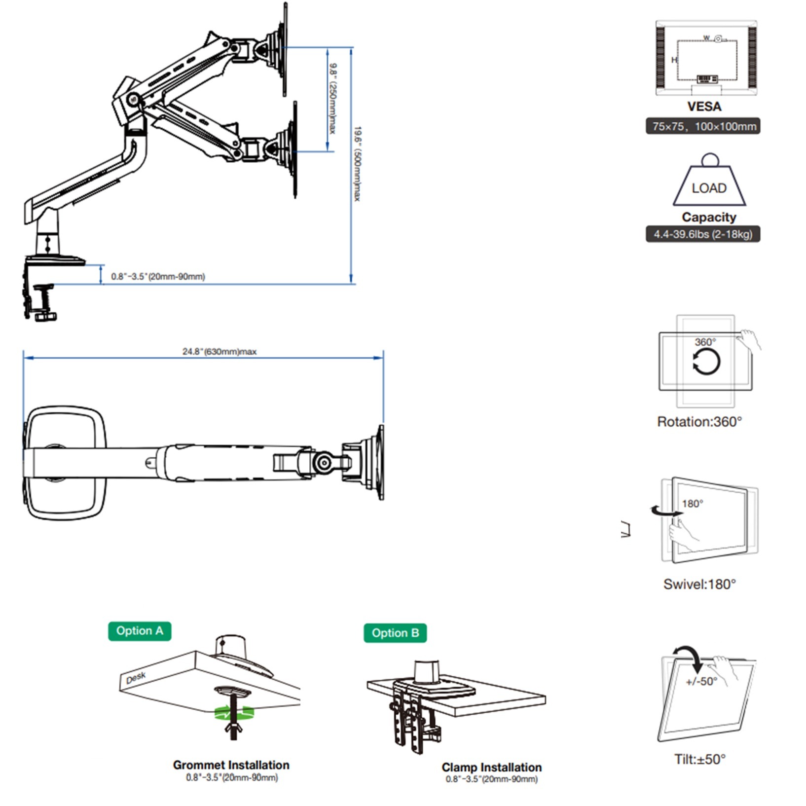 • Easy 5-Minute Installation: Includes everything you need—no toolbox quest required. Mount with either C-Clamp or Grommet (fits 0.8″–3.1″ desks). Pro Tip: Adjust tension only after mounting the monitor for optimal balance and gas spring longevity.