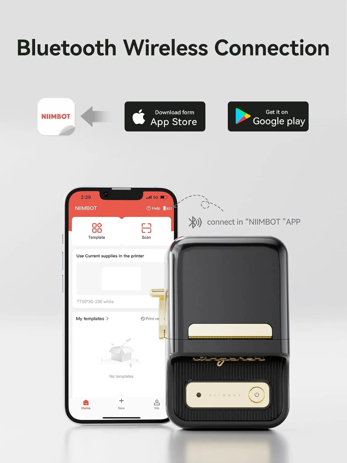 - Wireless Convenience – Connect seamlessly via Bluetooth to Android and iOS (except iPad). Also supports USB connection to PC (NIIMBOT software required).