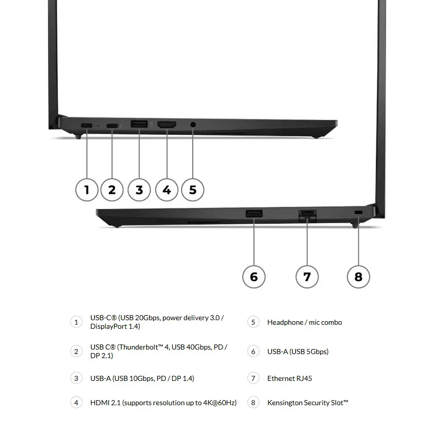 - Ports : 1 x K-Lock; 1 x RJ45; 1 x USB-A 3.2 Gen 2; 1 x USB-A 3.2 Gen 1; 1 x USB-C 3.2 Gen 2; 1 x Combo Audio Jack; 1 x HDMI 2.1 TMDS; 1 x Thunderbolt™ 4