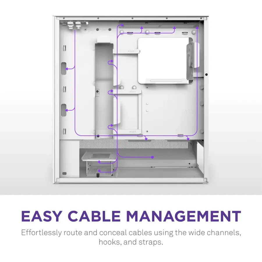 - Optimized Cable Management: Wide channels, integrated straps, and hooks offer seamless cable routing behind the motherboard tray.