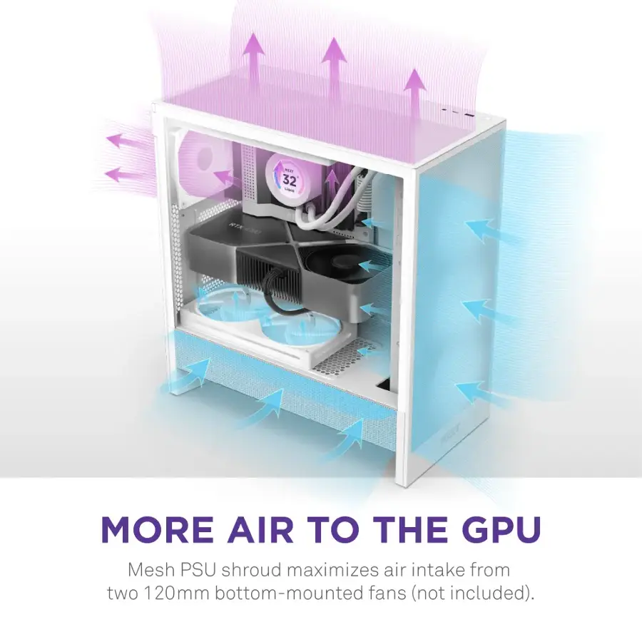 - Enhanced GPU Cooling with Mesh Shroud: Perforated PSU shroud pulls extra cool air from bottom-mounted 120mm fans (not included) to support high-power GPUs.