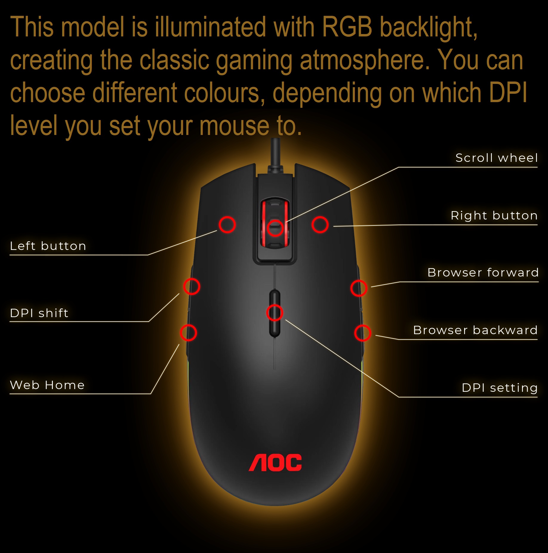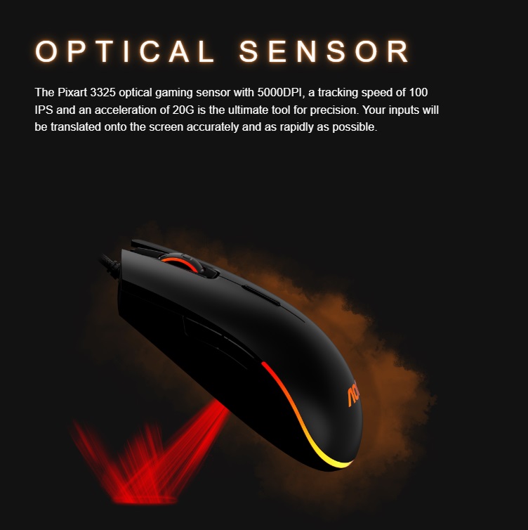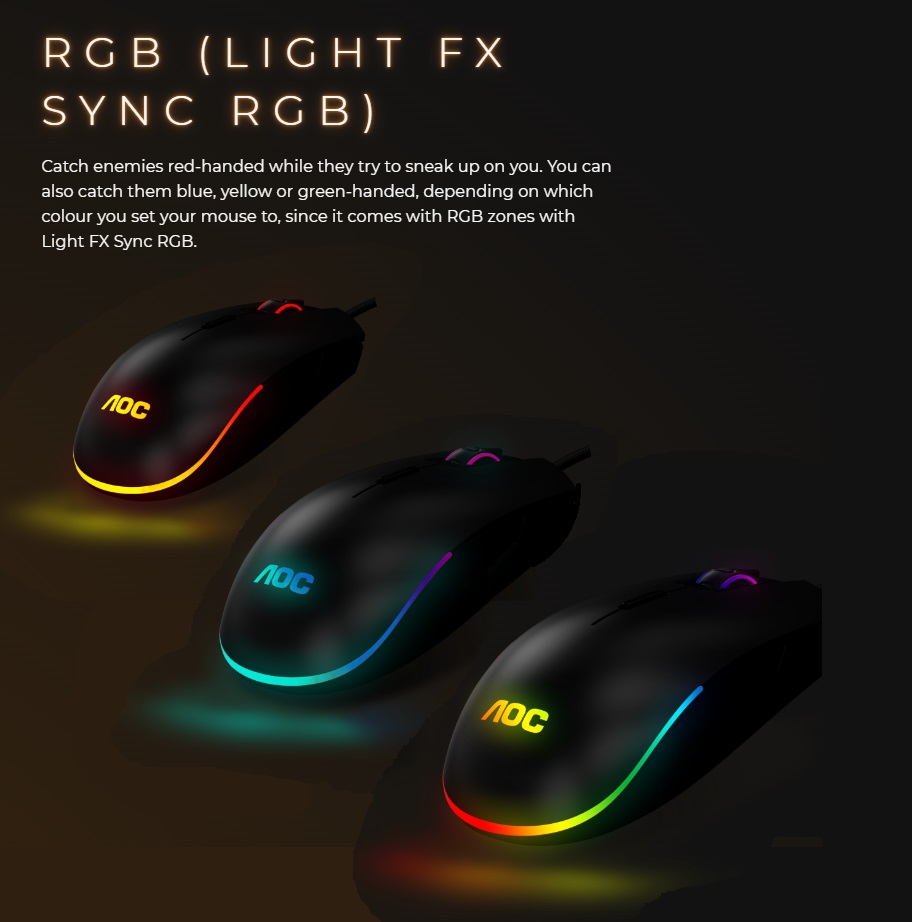 AOC GM500 RGB Gaming Mouse – Adjustable 5000 DPI – Omron switches – 4 RGB Effects – 8 Buttons – Up to 20G Acceleration – USB 2.0 Type A Interface – Exclusive Software – BLACK