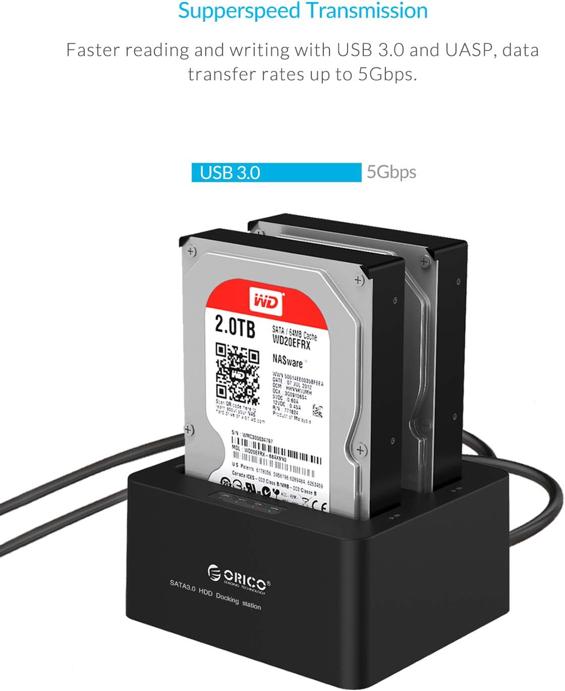 Support up to 24 TB Capacity ( two 12TB ) 2.5 inch / 3.5 inch SATA I II III HDD SSD hard drives simultaneously with Dual bay docking station,Support UASP Protocol.