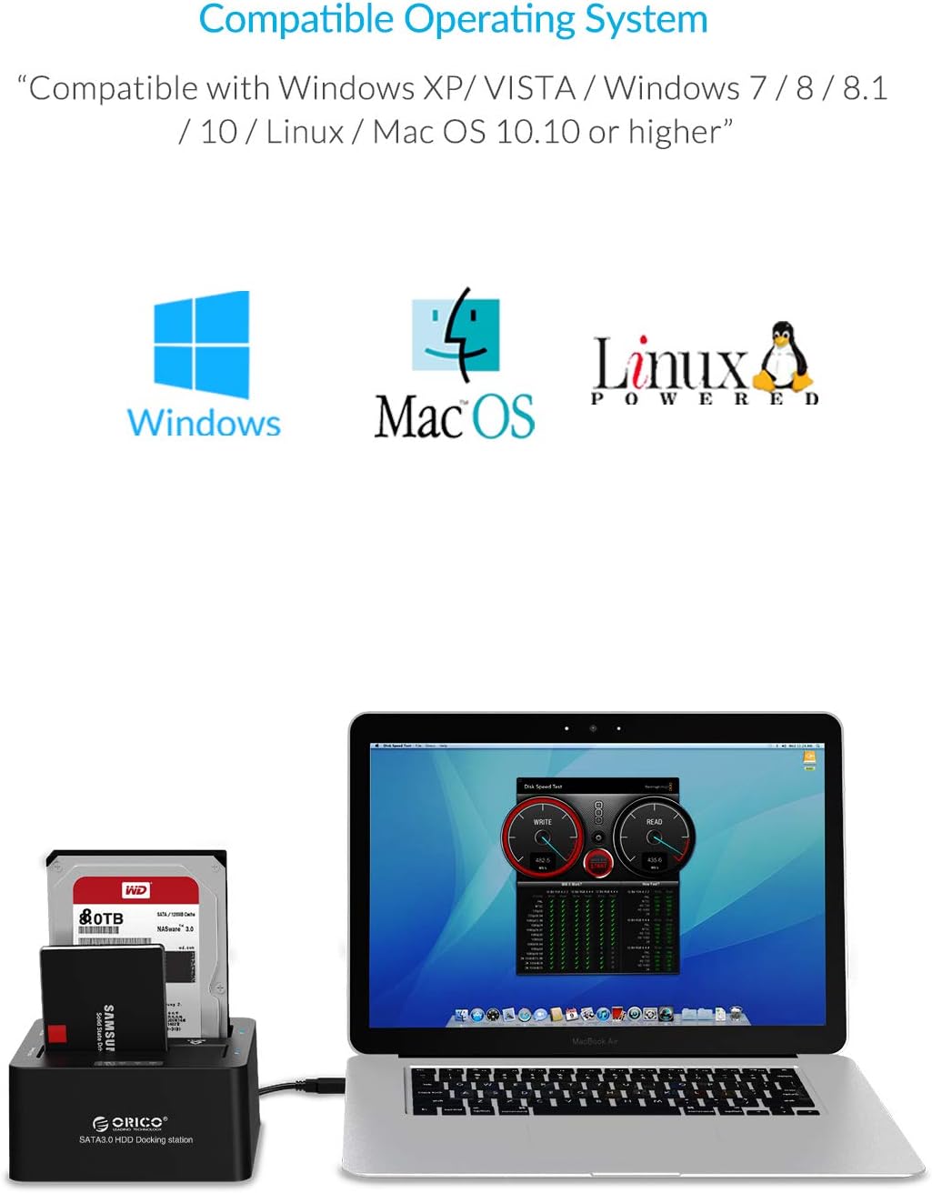 • ➤【Compatible Operating System】: The hard drive dock is compatible with Windows XP/ VISTA/ Windows 7/ 8 /8.1/ 10/ Linux/ Mac 9.1/10.2 or higher.