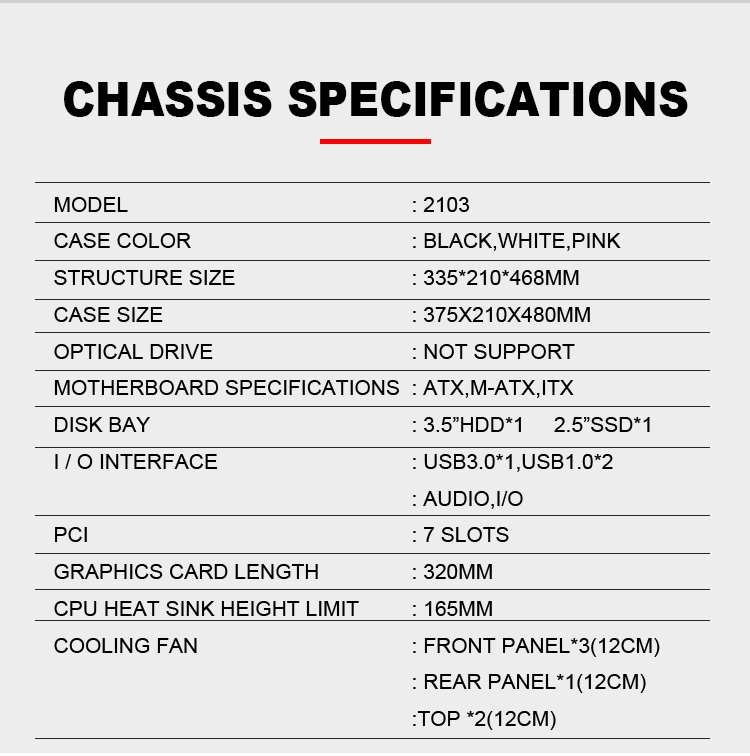 | Cooler Fan Support | front panel 3*120mm top 2*120mm rear 1*120mm bottom2*120mm |
