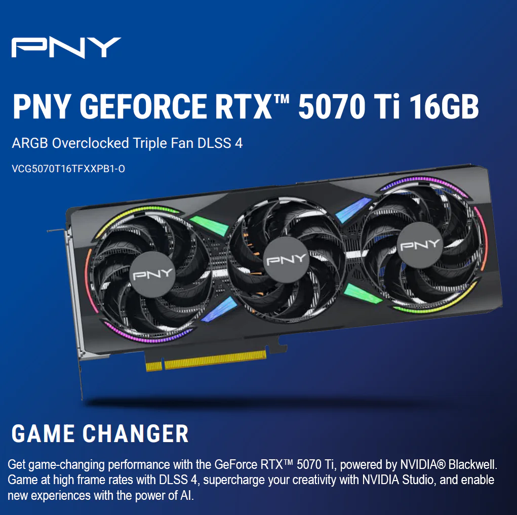 PNY GeForce RTX 5070 Ti OC ARGB EPIC-X Overclocked Triple Fan GPU 16GB GDDR7 Blackwell Architecture With 8,960 CUDA Cores & 2.3 GHz Clock Speed , DLSS 4 Ray Tracing PCIe 5.0 HDMI DP 2.1