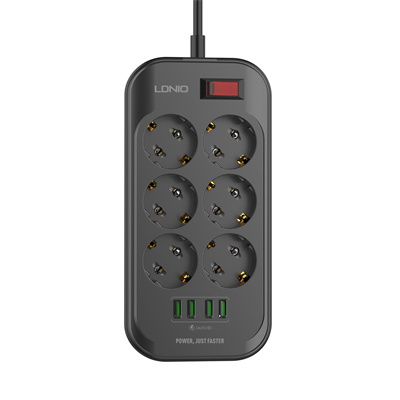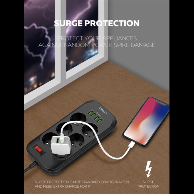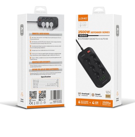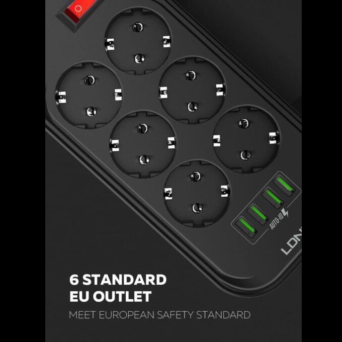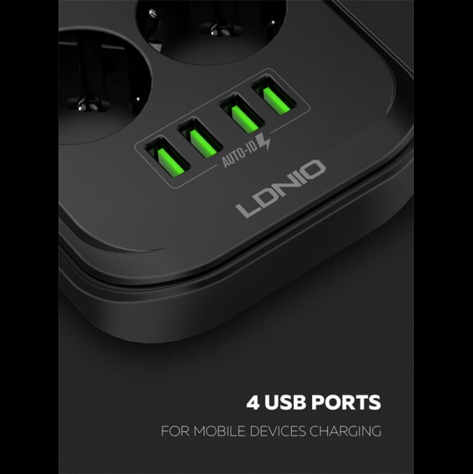 LDNIO EU Power Strip Extension 4 EU Sockets 4 USB-A With 2 Meter Cord ; Max Output 2500W ; 17W USB Smart Device Recharge ; Child Safety ; Surge Protection | BLACK SE6403
