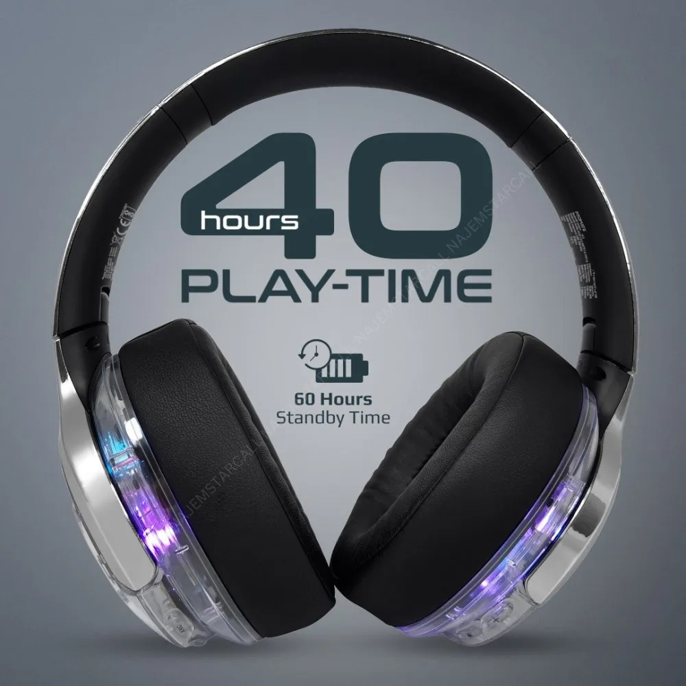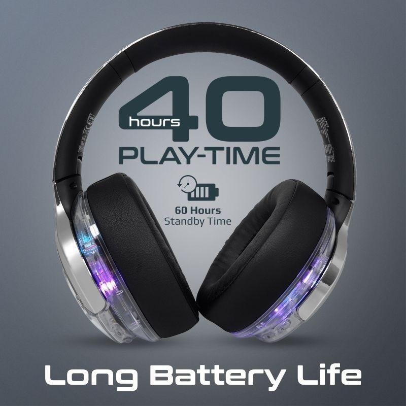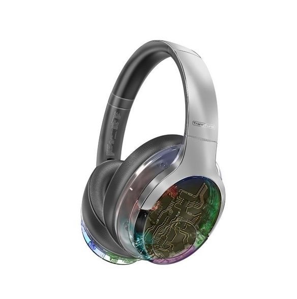 Promate WIRERLESS HEADPHONES RGB TRANSPARENT RAINBOW LED BACKLIT TRANSUNE Active Noise Cancelling , Hi-Fi STEREO , FLIP & FOLD – SILVER