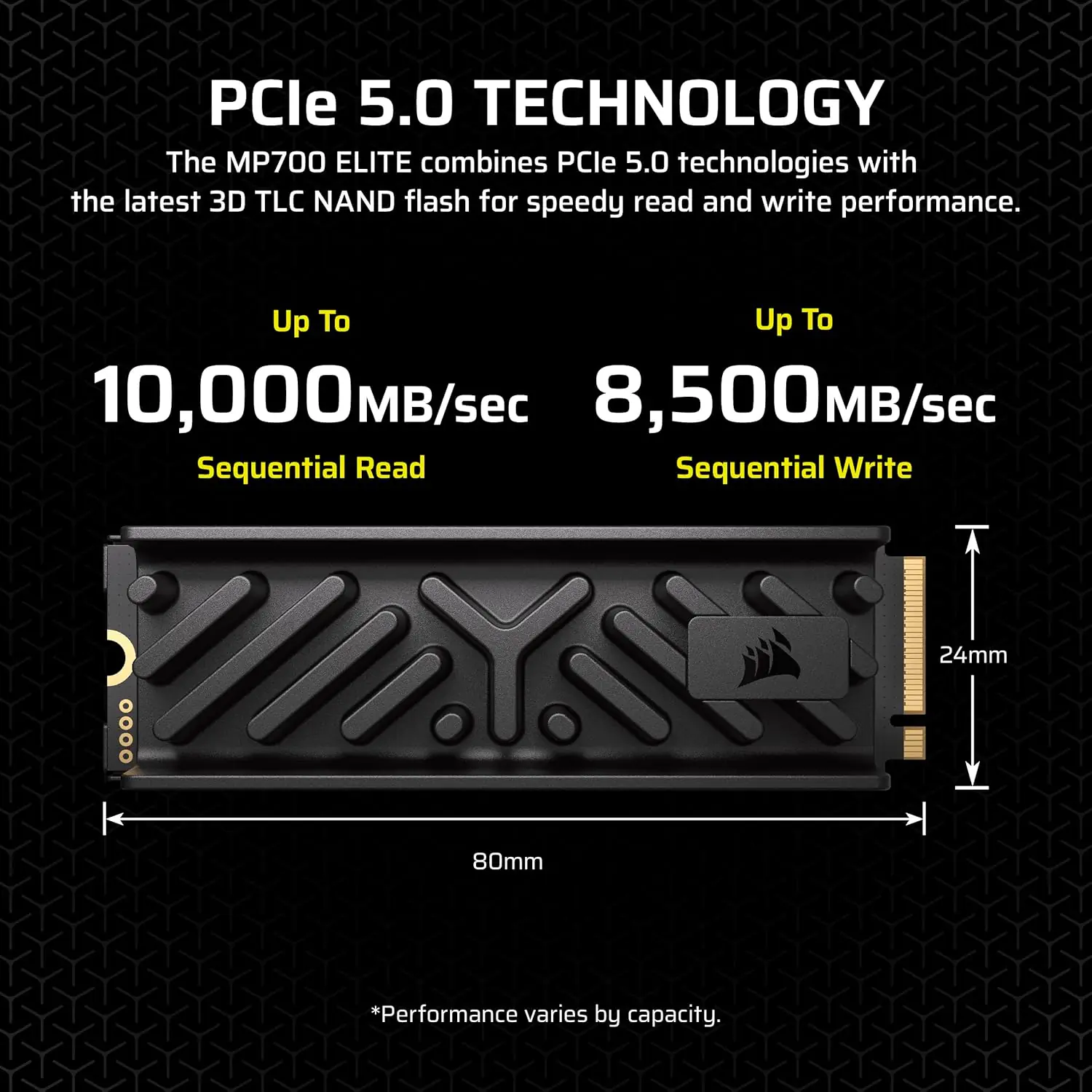 Corsair MP700 Elite 2TB PCIe 5.0 x4 NVMe M.2 SSD – Included Aluminum Heatsink – Up to 10,000MB/sec – High-Density 3D TLC NAND – M.2 2280 – DirectStorage Compatible | Black CSSD-F2000GBMP700EHS