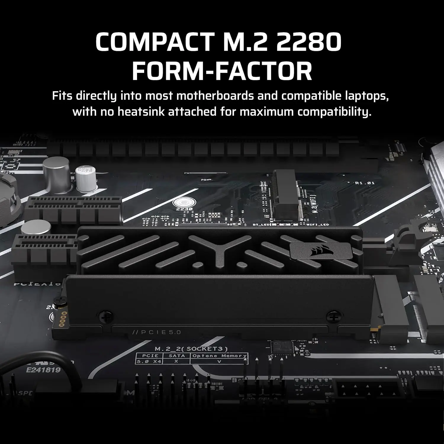 | Features | * High-performance PCIe 5.0 x4 NVMe 2.0 interface * Up to 10,000MB/sec sequential read speeds * Load games, boot windows, open and transfer files, all faster than ever * Microsoft DirectStorage compatible * High-density 3D TLC NAND memory * Strong endurance up to 1,200TB Written * Compact M.2 2280 form-factor for desktop and laptop PCs * Pre-installed aluminum heatsink * Backward compatible with PCIe Gen4 and Gen3 * CORSAIR SSD Toolbox software |