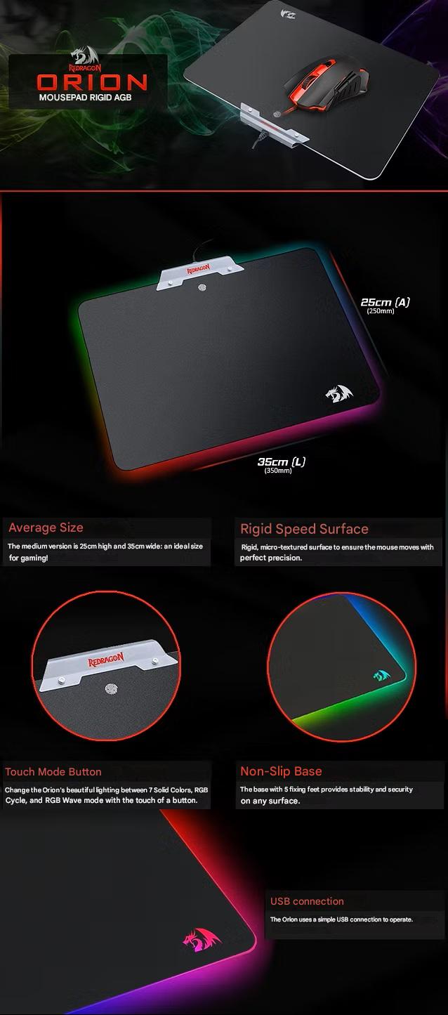 Redragon P011 Orion RGB Mousepad, Hard Surface, Waterproof, Colorful LED Lighting Gaming Mouse Pad ; 38.4 x 29.79 x 2.39 cm