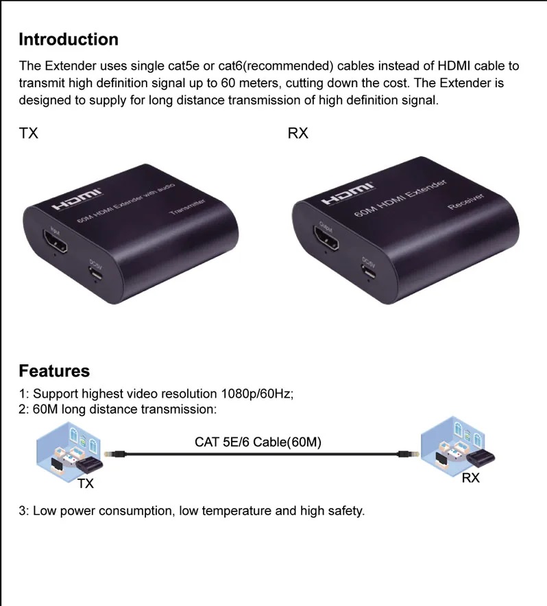 • When transmitting a signal in 1080p resolution the CAT6 operating distance is 60 meters.