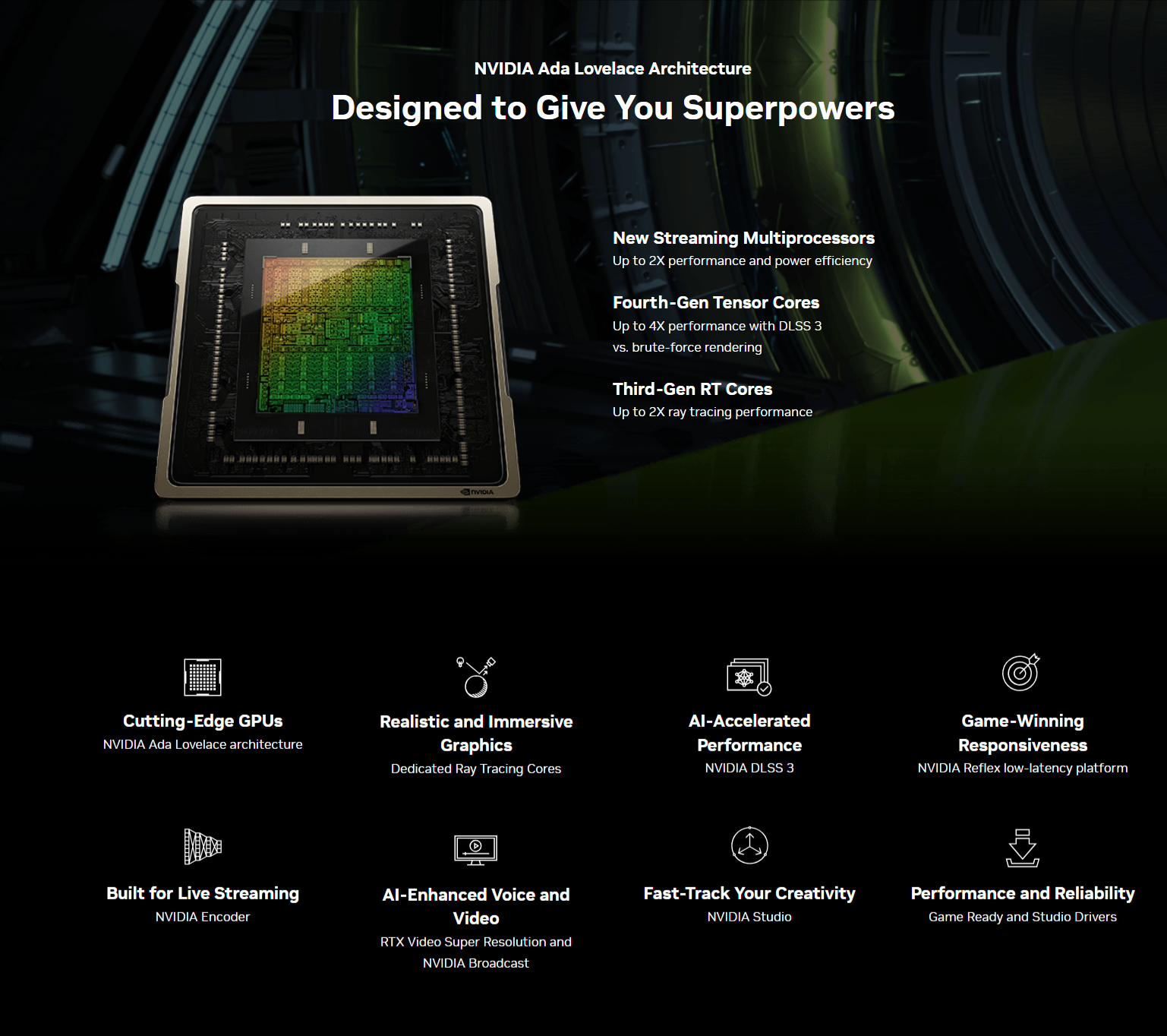 Get equipped for supercharged gaming and creating with the NVIDIA® GeForce RTX™ 4070 SUPER. It’s built with the ultra-efficient NVIDIA Ada Lovelace architecture. Experience super fast ray tracing, AI-accelerated performance with DLSS 3, new ways to create, and much more.