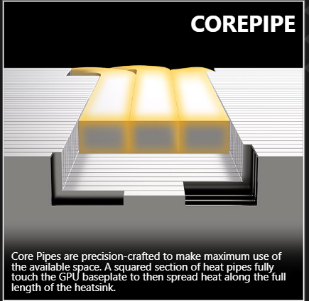 - Core Pipe:Â Precision-crafted heat pipes ensure max contact to the GPU and spread heat along the full length of the heatsink.