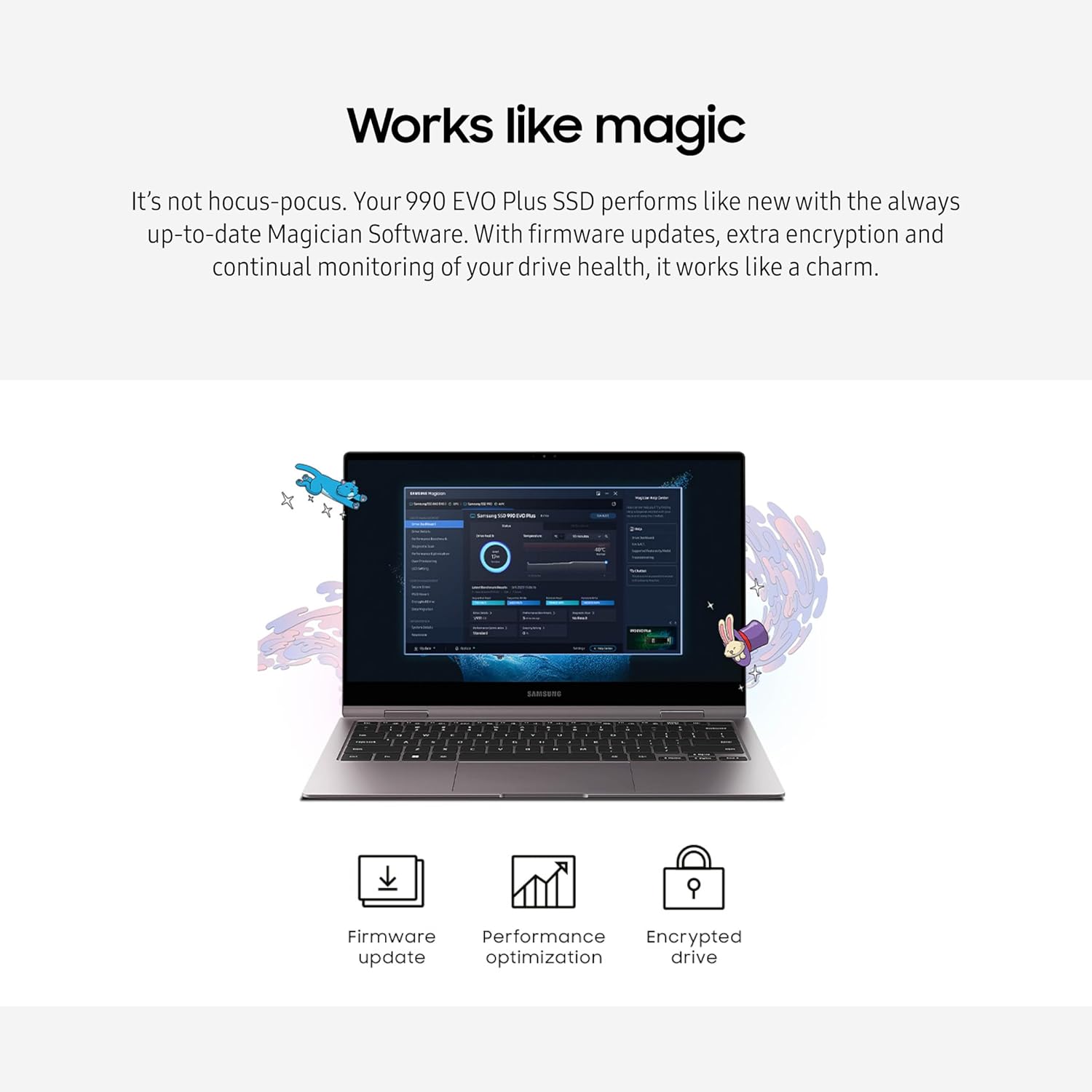- NEVER MISS AN UPDATE: Your 990 EVO Plus SSD performs like new with the always up-to-date Magician Software. Stay up to speed with the latest firmware updates, extra encryption, and continual monitoring of your drive health–it works like a charm.