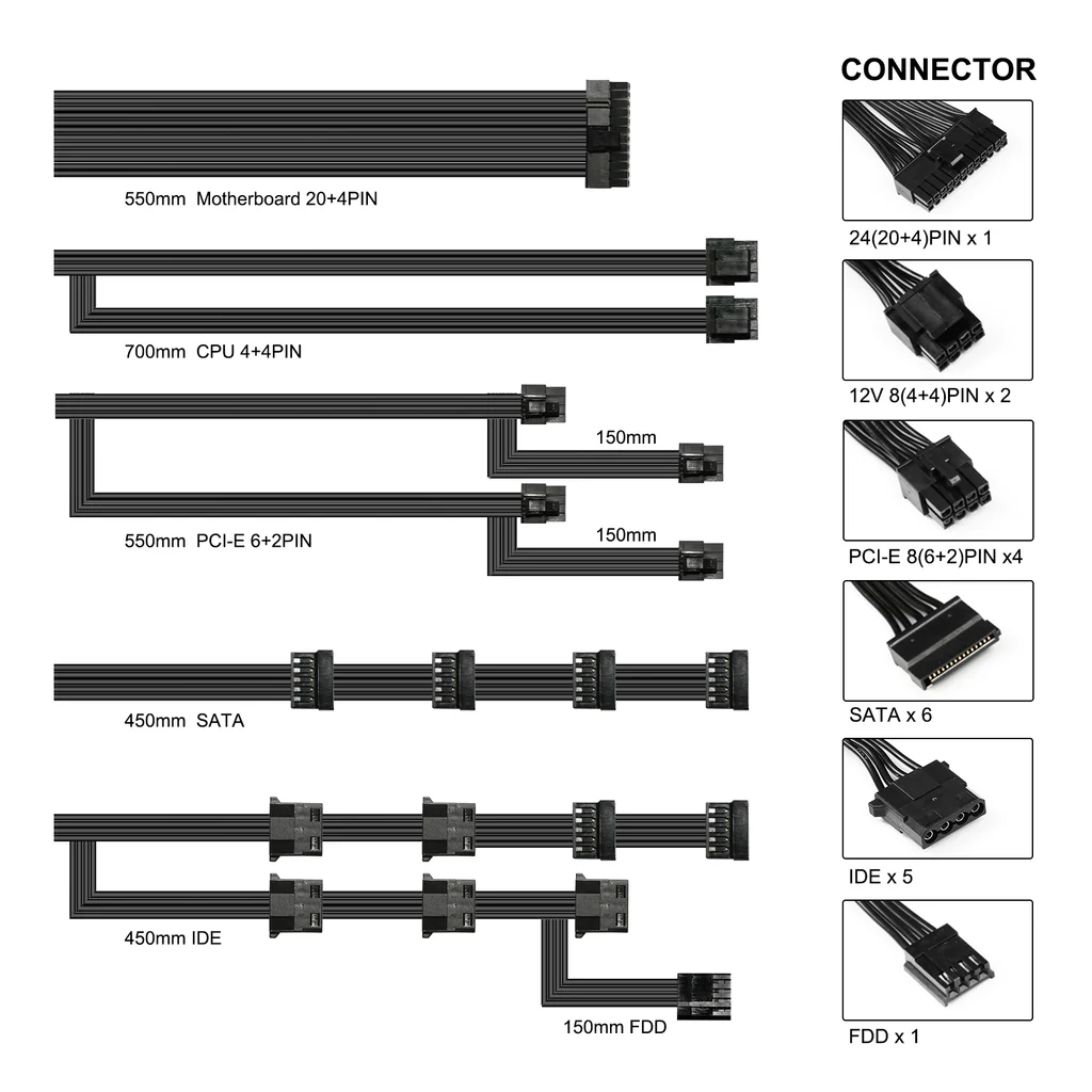 | Connectors | 6+2 Pin PCIe, 24-Pin ATX, 4+4 CPU, SATA, Molex |