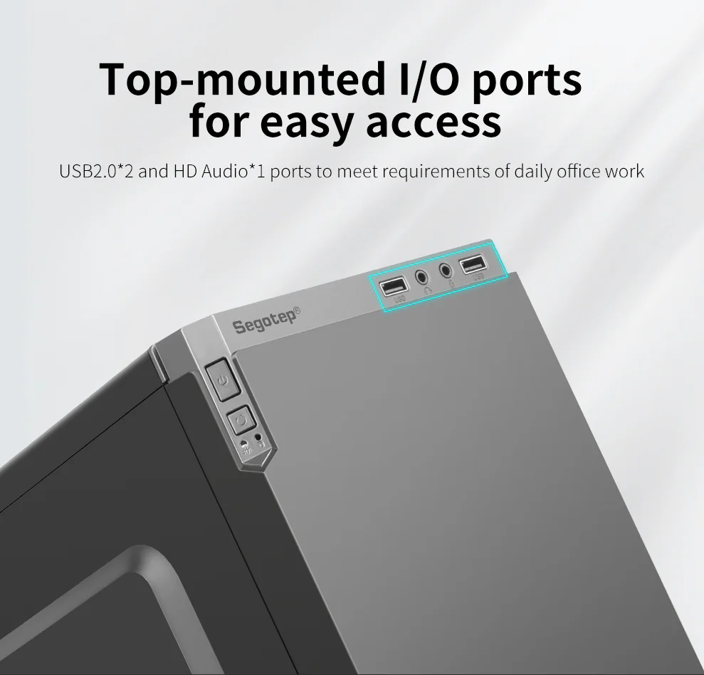 - ✅ Top I/O Panel – Includes USB 2.0 x2 and HD Audio for daily connectivity.