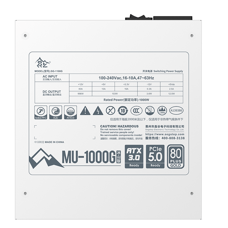Segotep MU-1000G 1000W PSU Kunlun 80 Plus Gold Certification ATX 3.0 & PCIe 5.0 Full Modular Power Supply Active PFC FDB Fan LLC Pro + DC-DC Framework – WHITE