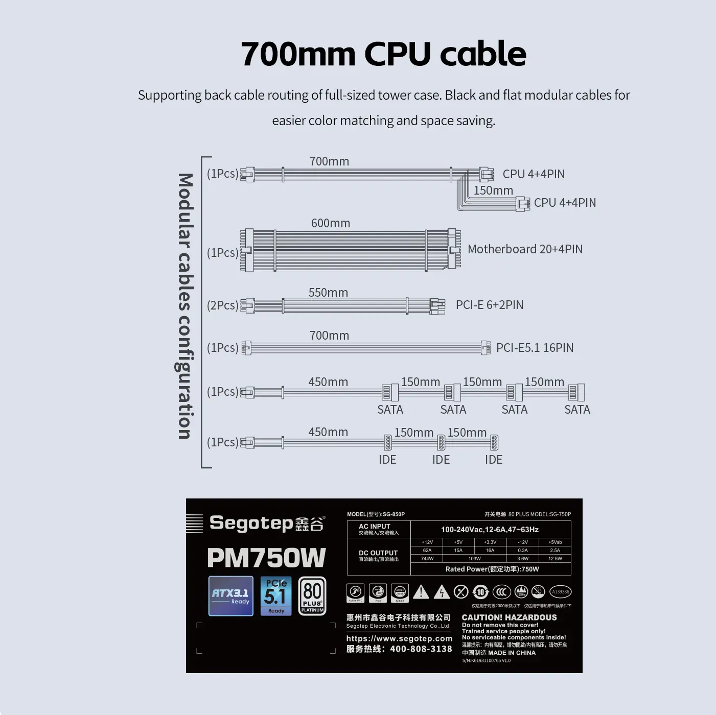 Segotep PM750W 80+ Platinum PSU | ATX 3.1 | 750W | Fully Modular | PCIe 5.1 | AI Cooling | Silent Hydraulic Fan | High-Efficiency Gaming Power Supply