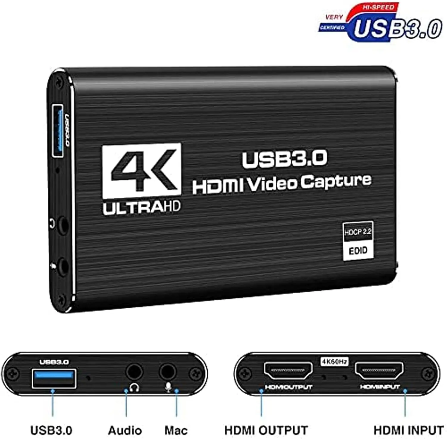 Smart Plus HDMI Video Capture 3K UltraHD USB 3.0 With 4K Input 1080P 60fps Output, HDMI Loop-Out, Mic And Headphone Ports, Plug And Play, Windows Mac Linux Console Compatible