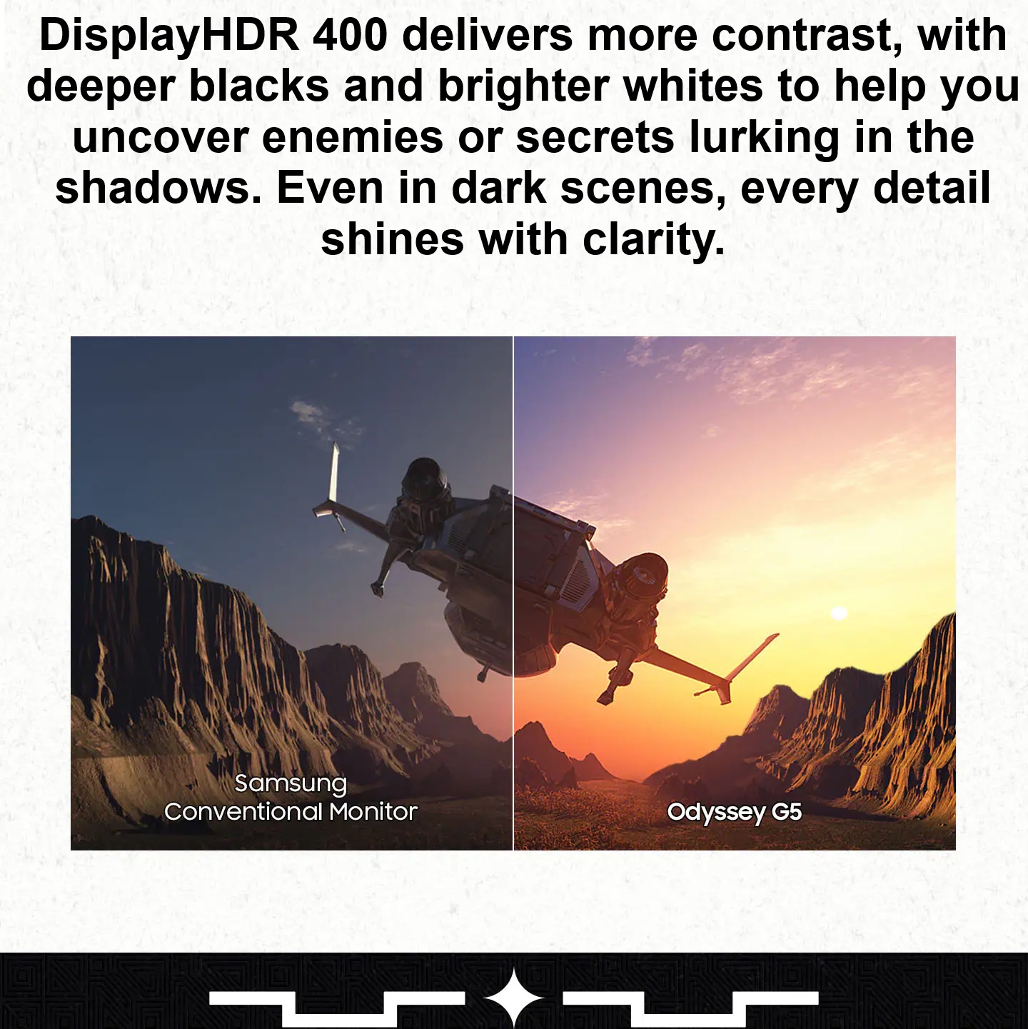 - VESA DisplayHDR 400: Reveal the whole picture. DisplayHDR 400 delivers more contrast, with deeper blacks and brighter whites to help you uncover enemies or secrets lurking in the shadows. Even in dark scenes, every detail shines with clarity.