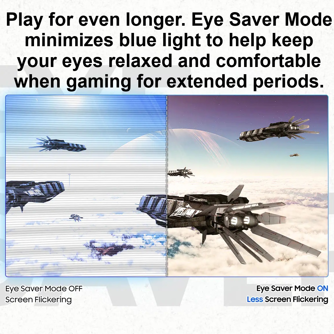 - Eye Saver Mode & Less Screen Flickering: Play for even longer. Eye Saver Mode minimises blue light to help keep your eyes relaxed and comfortable when gaming for extended periods. The Odyssey G5 also reduces irritating and tiring screen flicker, so you can focus longer with less distraction and eye strain.