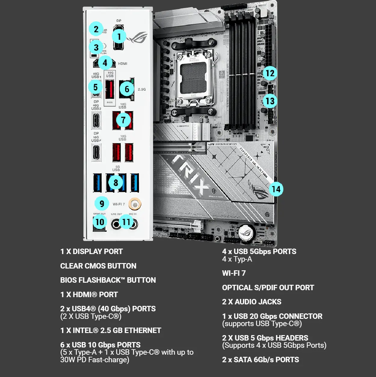 | Back I/O Ports | 2 x USB4 (40Gbps) ports (2 x USB Type-C with DP Alt mode) 6 x USB 10Gbps port(s) (5 x Type-A + 1 x USB Type-C with up to 30W PD Fast-charge) 4 x USB 5Gbps port(s) (4 x Type-A) 1 x DisplayPort 1 x HDMI port 1 x Wi-Fi module 1 x Intel 2.5Gb Ethernet 2 x Audio jacks 1 x Optical S/PDIF out port 1 x BIOS FlashBack button 1 x Clear CMOS button |