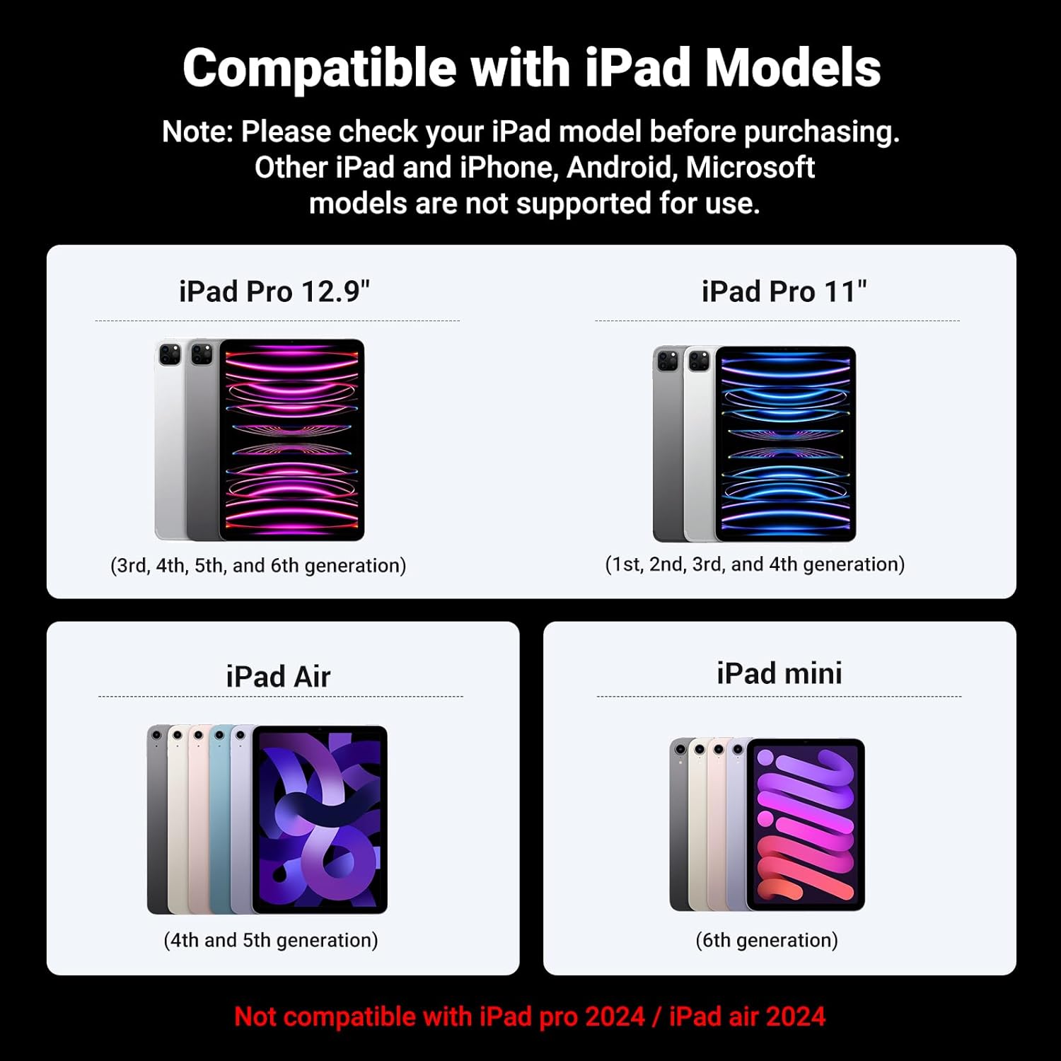 - Compatible iPad Pro 12.9″ 2018-2022 (A1876 A2014 A1895 A1983 A2229 A2233 A2069 A2232 A2378 A2461 A2379 A2462 A2436 A2764 A2347 A2766); Compatible iPad Pro 11″ 2018-2022 (A2013 A1934 A1979 A1980 A2228 A2231 A2068 A2030 A2377 A2459 A2301 A2460); Compatible iPad Air 2019-2022 (A2316 A2324 A2325 A2072 A2588 A2589 A2591); Compatible iPad mini 2021(A2567 A2568 A2569). Note: Please check that your iPad model is compatible before purchasing.