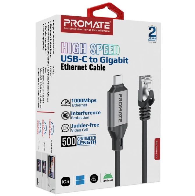 PROMATE High-Speed Gigabit Ethernet Cable to USB-C 1000Mbps; Ultra-Fast 10/100/1000Mbps Ethernet to USB-C™ Adapter Cable ; Universal Compatibility with all USB-C™ Devices ; 5 meters CAT6 UTP ; RJ45 Input to USB-C™ Output | CLINK-RJ45