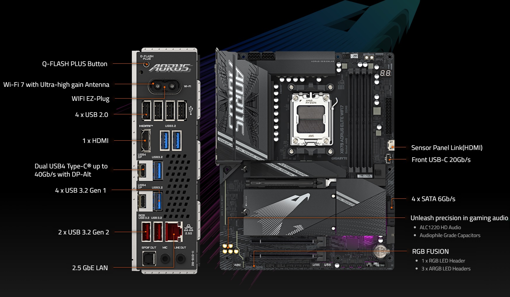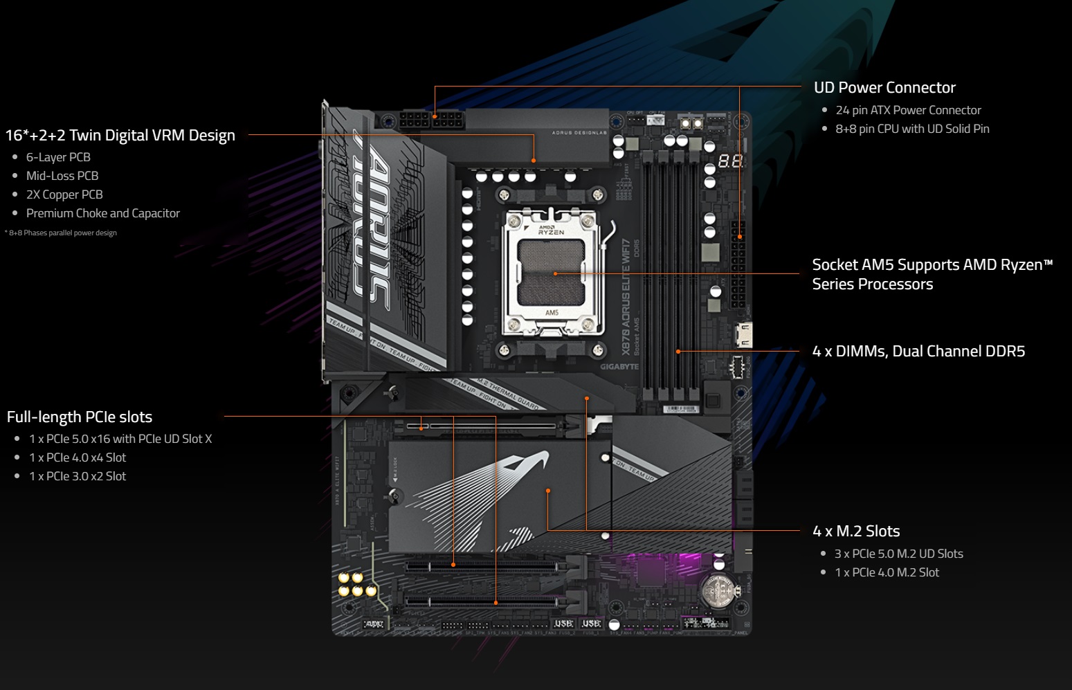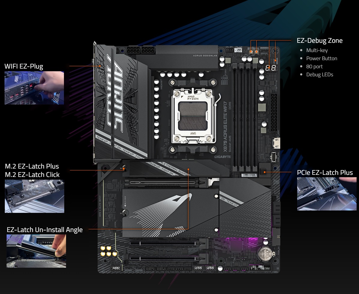 GIGABYTE X870 AORUS ELITE WIFI7 AM5 LGA 1718, ATX, DDR5, 4x M.2, PCIe 5.0, USB4, Wi-Fi 7, 2.5GbE LAN, EZ-Latch ; Supports AMD Ryzen™ 9000 / 8000 / 7000 Series Processors