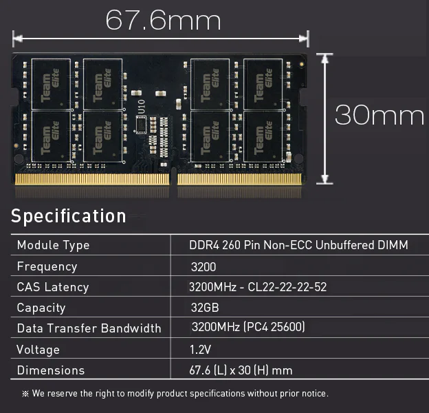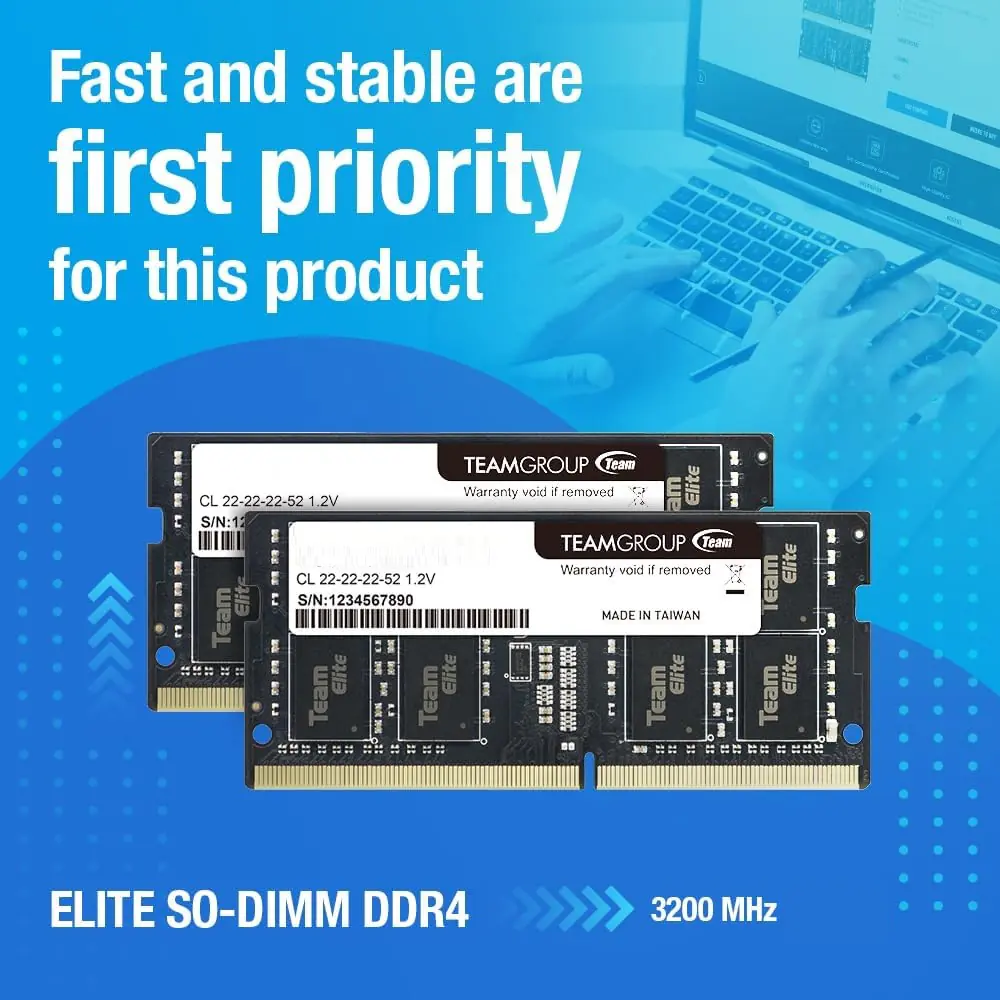 TeamGroup Elite 32GB DDR4 3200MHz CL22 SODIMM RAM – 1.2V, PC4-25600, Unbuffered, Non-ECC, 260-Pin Single Module for Laptops & Notebooks | TED432G3200C22-S01
